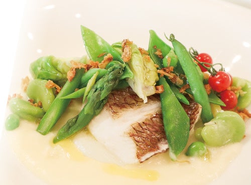 蒸した紀州梅まだいに新玉ねぎのソースをかけた優しいテイストの一品です。