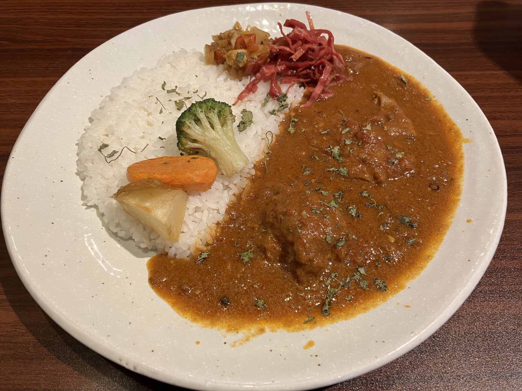 「赤缶カレー粉」の香りを最大限に活かした香り立ちと、軽やかながらも奥深くスパイシーな味わいが楽しめるカレーです。