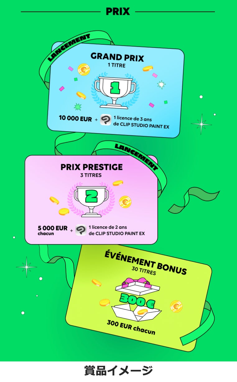 「WEBTOON CONCOURS 2024」は、フランス語圏のクリエイターに向けたWebcomicコンテストです。「WEBTOON FRANCE」にWebcomic作品を投稿することで応募できます。グランプリ1名、準グランプリ3名には、5,000ユーロから10,000ユーロの賞金と「CLIP STUDIO PAINT」、その他受賞30作品に、300ユーロが進呈されます。応募期間は7月1日(月)~8月30日(金)までとなっており、結果発表は9月20日(金)を予定しています。