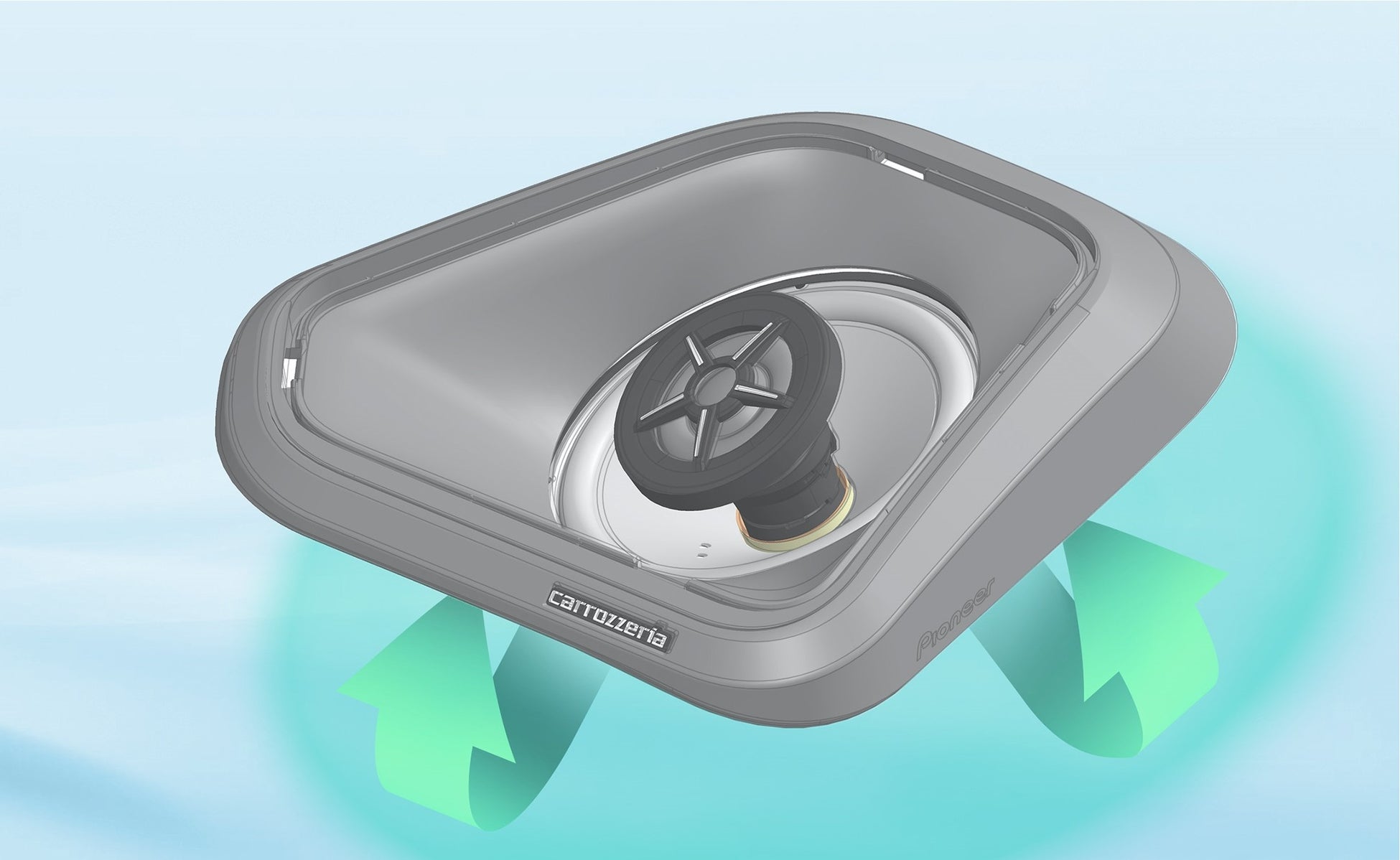 トゥイーター部に角度をつけた「クロスアキシャル機構」とスピーカー本体を傾斜させる「スラント機構スペーサー」により、フロントガラスへの反射を低減し、直接伝わる音が増えることによりクリアで実体感のある音を実現。また音の回り込みを防ぎ、豊かな中低域再生と、よりクリアな高域再生が可能となる「フレア形状グリルフレーム」を採用し、ノア/ヴォクシーに最適な臨場感のあるサウンドを実現します。