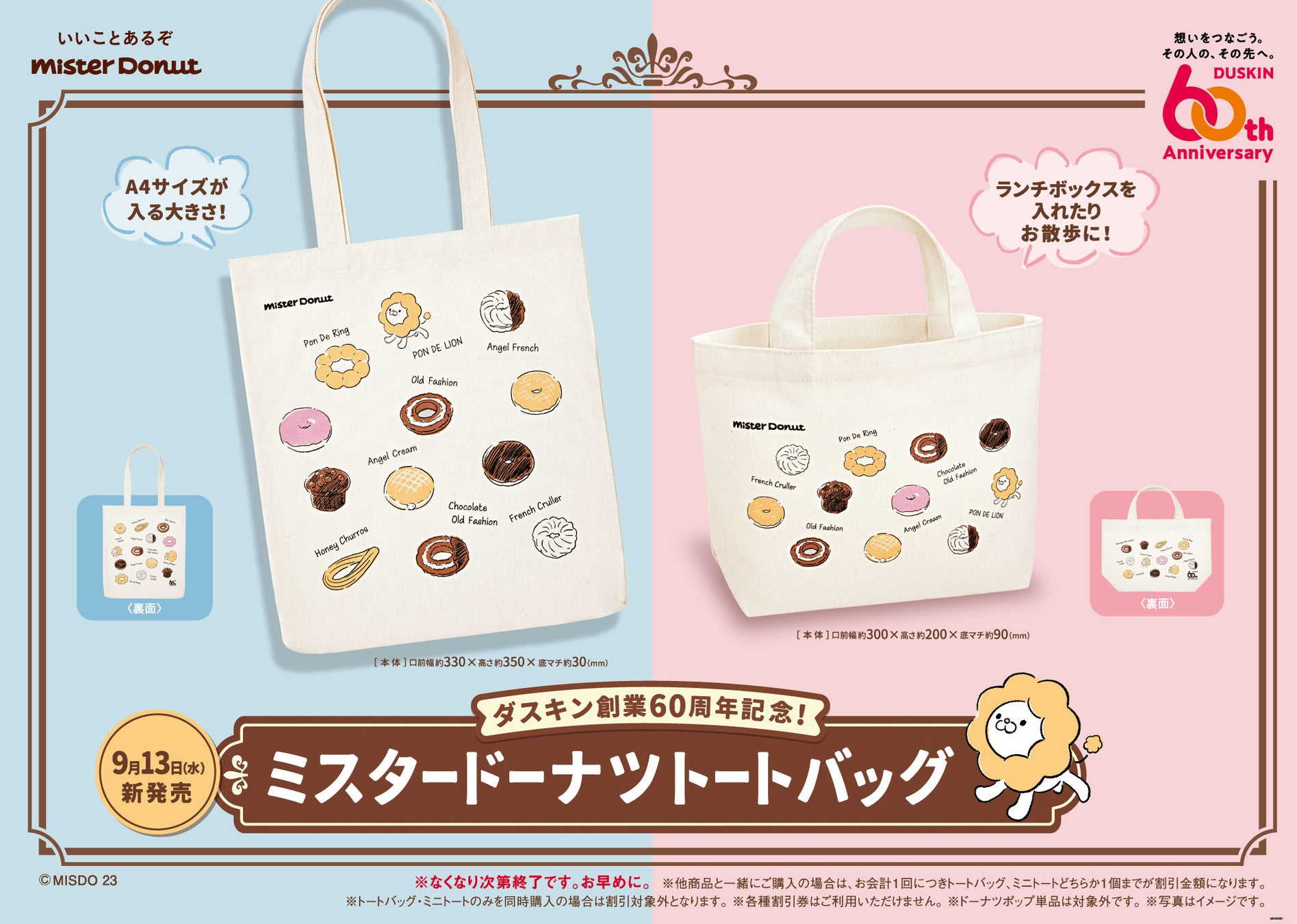 当社が運営するミスタードーナツでは、ダスキン創業60年を記念して9月13日(水)から、「ポン・デ・ライオンと仲間たち」や人気のドーナツがかわいいイラストとなってデザインされている『ミスタードーナツトートバッグ』『ミスタードーナツミニトート』を、数量・期間限定で発売します。
