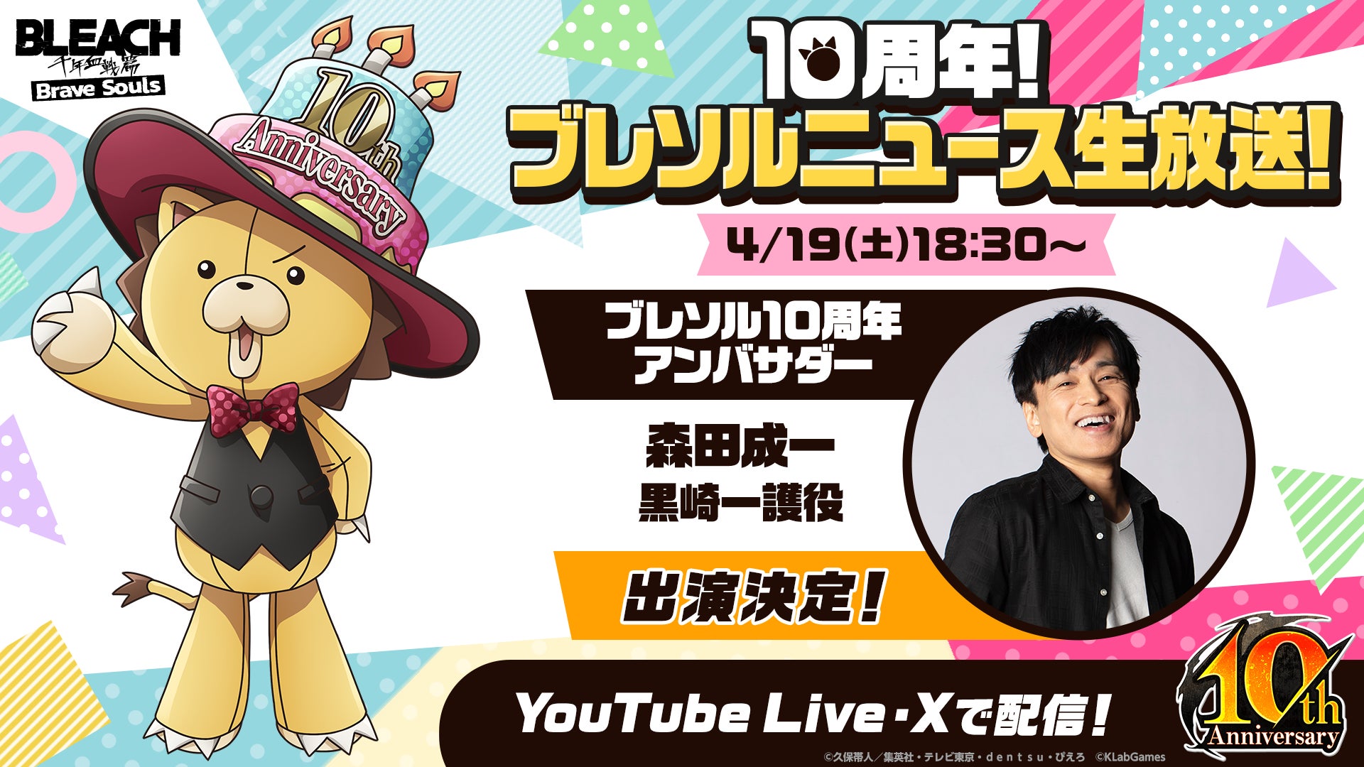 さらに、4月19日(土)18時30分(予定)から「10周年!ブレソルニュース生放送!」の配信も決定!年末の"卍解" 生放送でアンバサダー就任が発表された、黒崎一護役・森田成一さんに10周年の情報をリアルタイムでお届けいただきます。