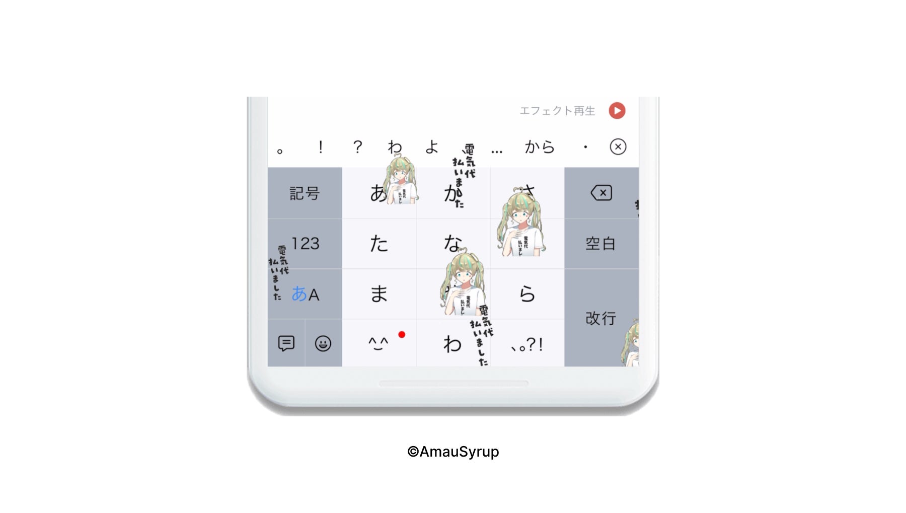 ユーザーが文字を入力し、変換候補より特定のキーワードを選択することで画像や動画がキーボード上に現れる機能です。当コラボでは特定のキーワード「さとうあま」「あまう」「電気代払えた」(他4ワード)と入力することでエフェクトが再生されます。今回のコラボならではのエフェクトをお楽しみください!