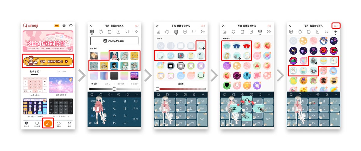 3)本コラボ限定デザインのパーツ(背景・ボタン・モーション・インタラクティブ)を選択し、右上の「完了」をタップして完成。