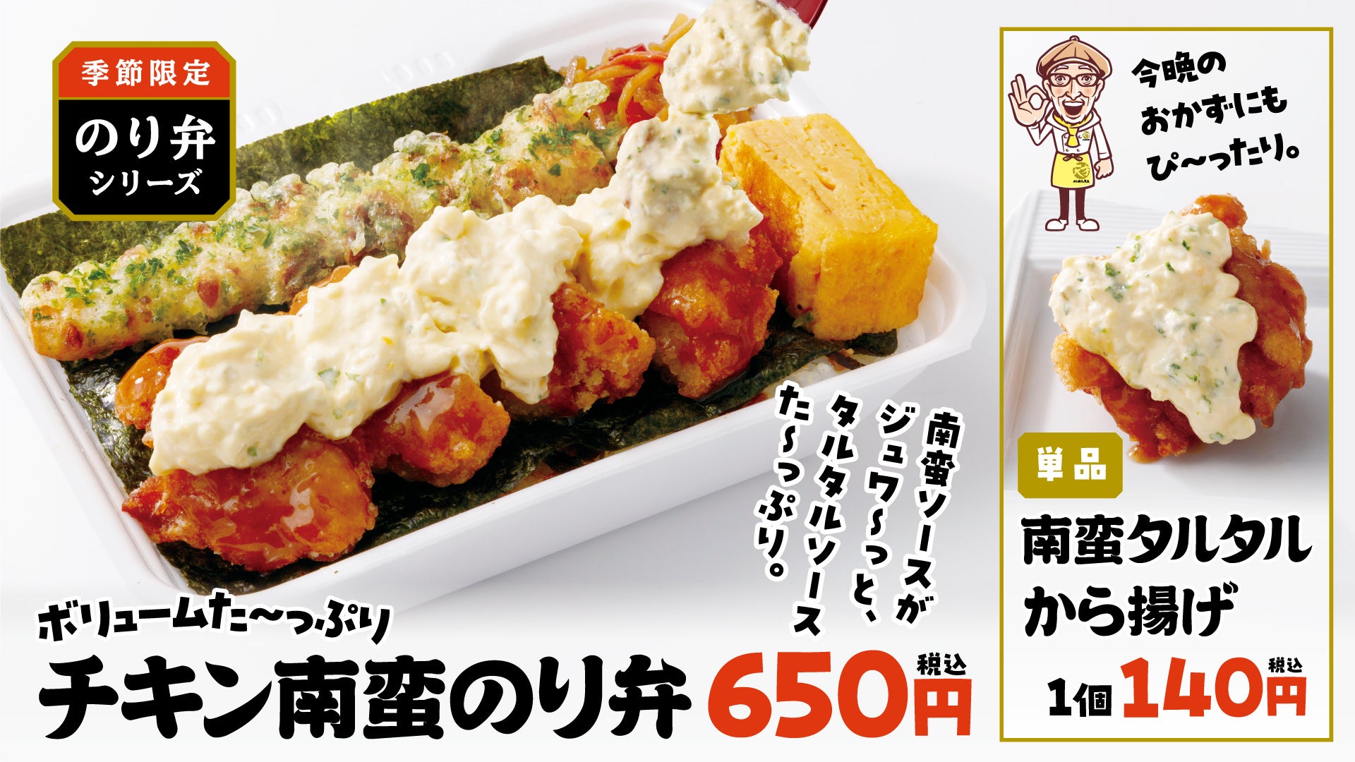 揚げたてから揚げとテリー伊藤こだわりの玉子焼き「から揚げの天才」は、期間限定「チキン南蛮のり弁当」を3月1日(水)より期間限定で販売開始します。大好評でした「カキフライのり弁」に続く、季節限定のり弁シリーズ第2弾!「チキン南蛮」を復活して欲しいという皆様からの声にお応えして、新メニュー「チキン南蛮のり弁」が新登場です。オリジナルタルタルソースをたっぷりかけた「チキン南蛮」が楽しめる、ボリュームたっぷりののり弁です。ボリューム満点なお弁当がなんと税込650円!!同時にから揚げの新フレーバーの「南蛮タルタルから揚げ」税込140円も販売開始します。ぜひこの機会にお試しください。