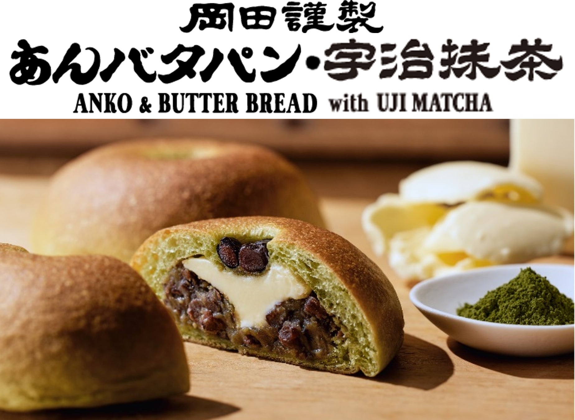 「岡田謹製 あんバタ屋」では、北海道千歳産の希少な小豆、『えりも小豆』を使用した餡子と、芳醇なバターを使用した人気商品、『あんバタパン』の季節商品として『あんバタパン・宇治抹茶』を数量限定で販売。餡子とバターの芳醇な味わいの中に宇治抹茶が引き立つ一品です。