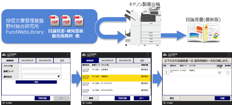 このほど、キヤノンMJとNRIは西日本シティTT証券に、NRIの投信文書プラットフォームサービス「FundWeb Library」※2からPC レスで簡単に複合機※3の操作パネル上で必要なデータを参照、検索し印刷が可能な証券会社向け”目論見書オンデマンド印刷システム”を構築しました。