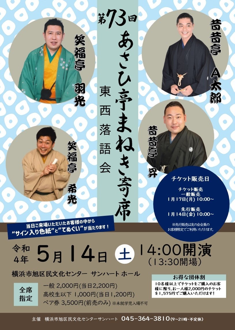 横浜市旭区民文化センターサンハート主催、東西落語会『第73回あさひ亭まねき寄席』が2022年5月14日 (土)に横浜市旭区民文化センター サンハート ホール(神奈川県横浜市旭区)にて開催されます。チケットはカンフェティ(運営:ロングランプランニング株式会社、東京都新宿区、代表取締役:榑松 大剛)にて1月17日(月)10:00より発売開始です。