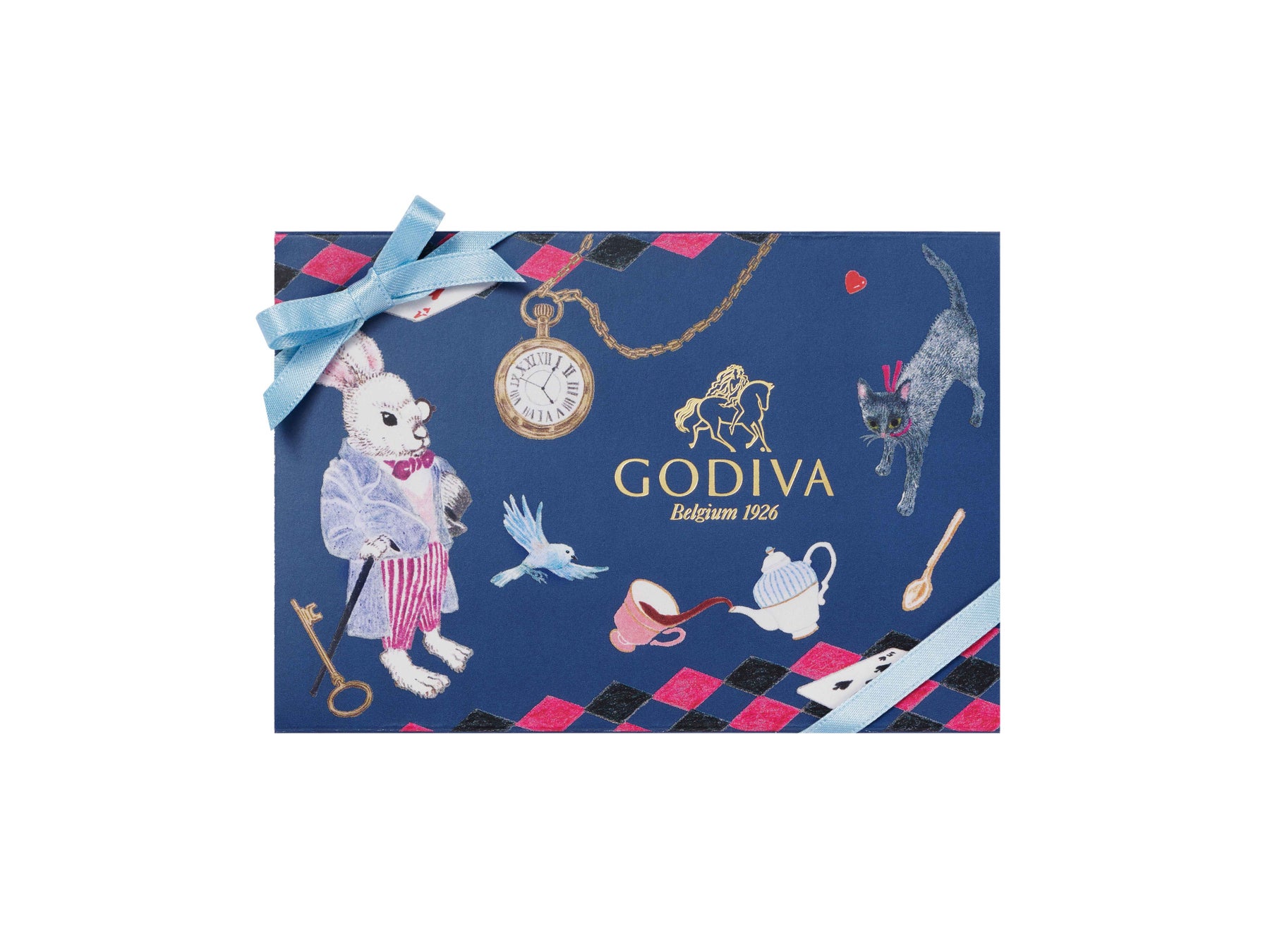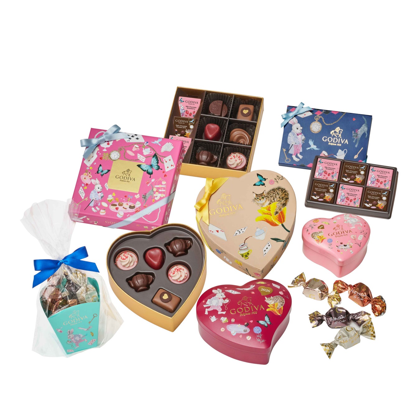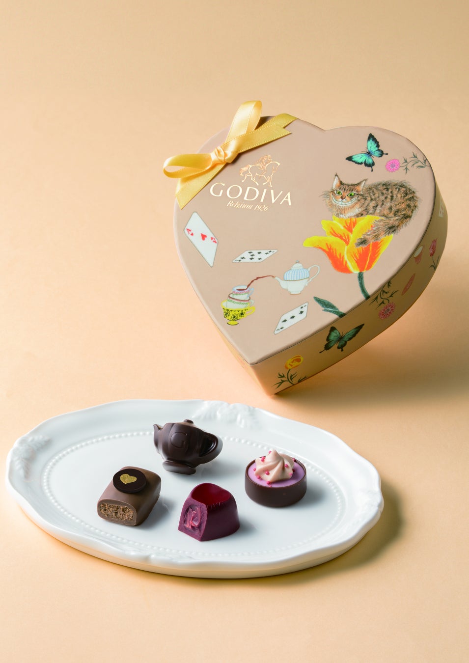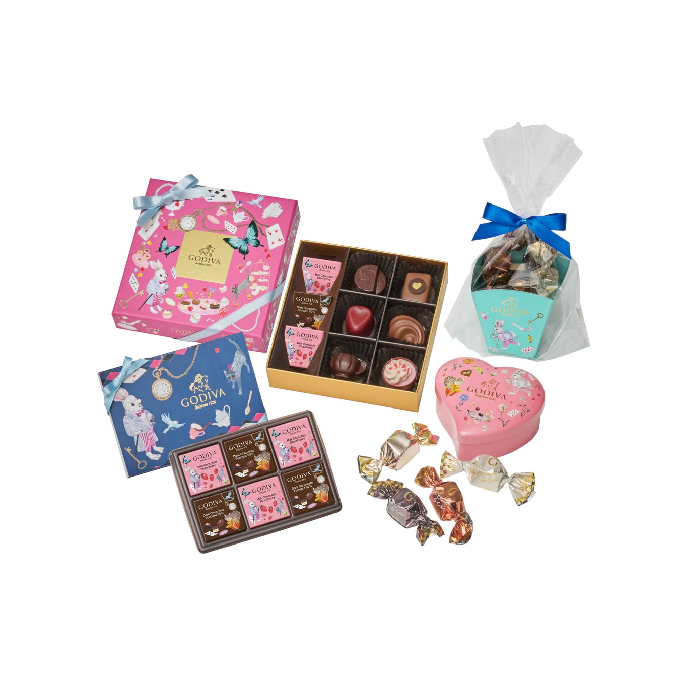ティーパーティを彩る紅茶をイメージしたチョコレートやゴディバの100周年を記念してリニューアルされたハート形のチョコレート、シーズン限定カレなどを、物語のシンボルのトランプやティーセット、白うさぎなどを描いたパッケージに詰め合わせました。