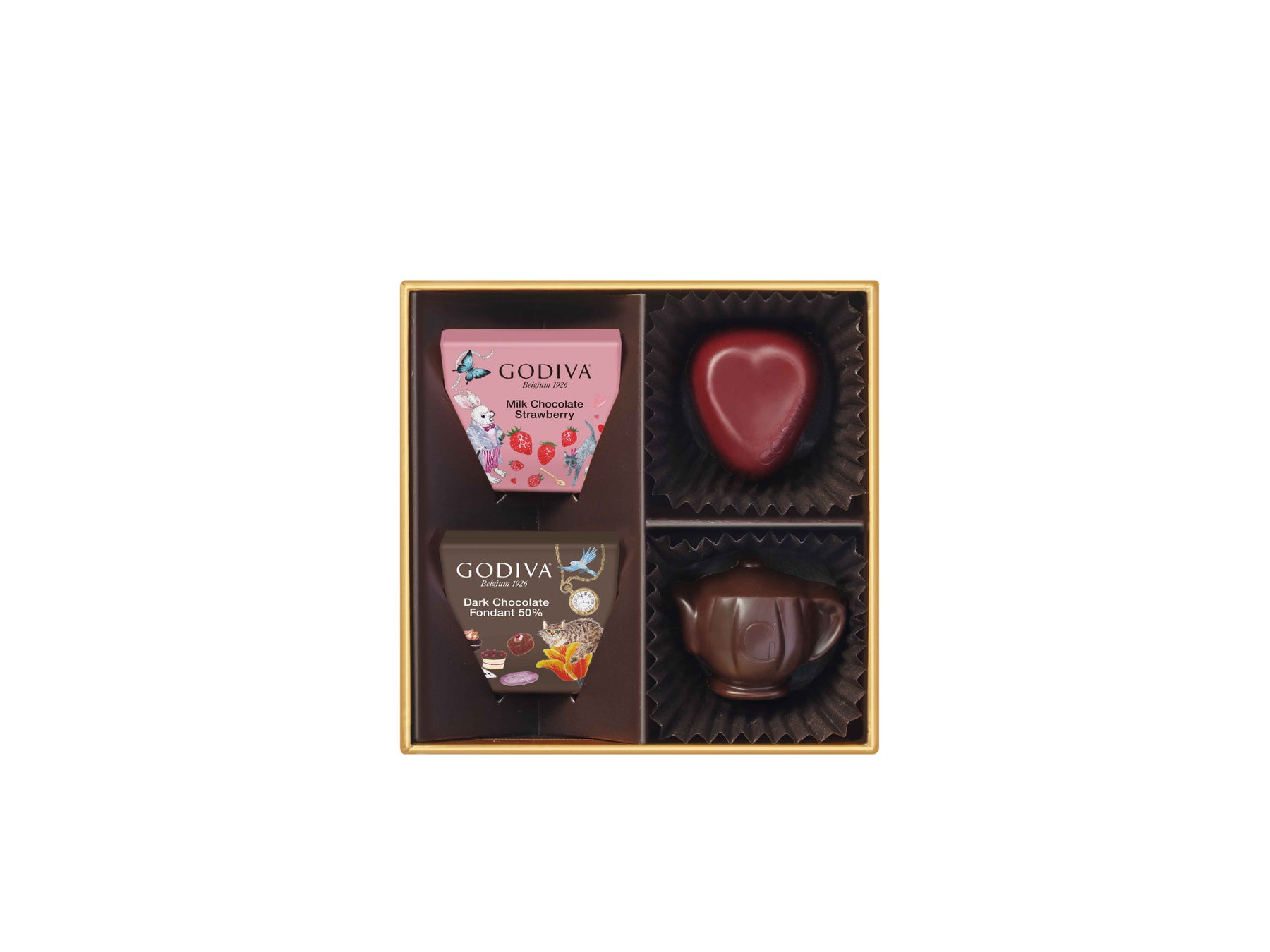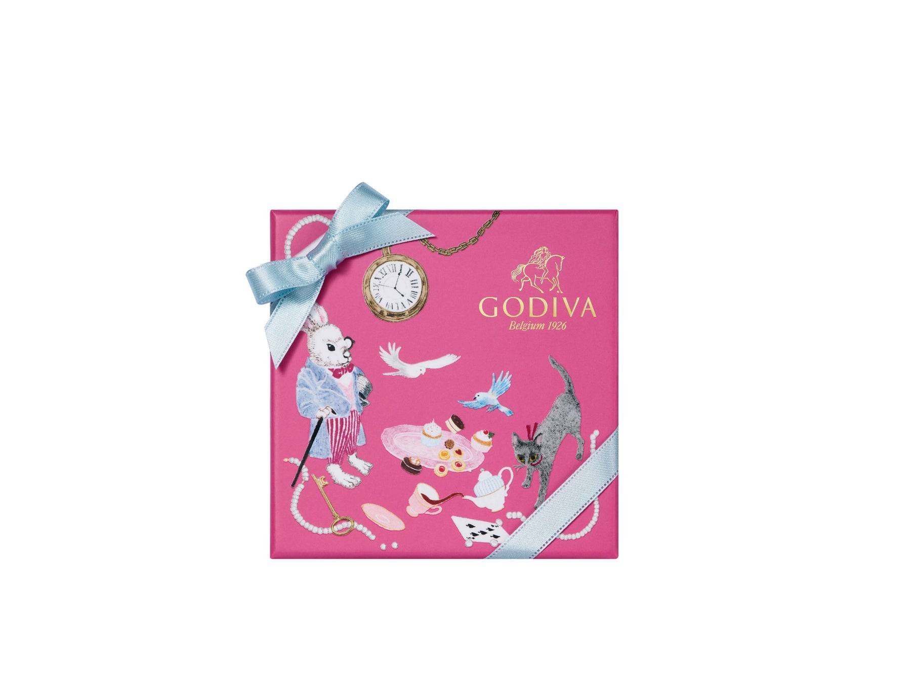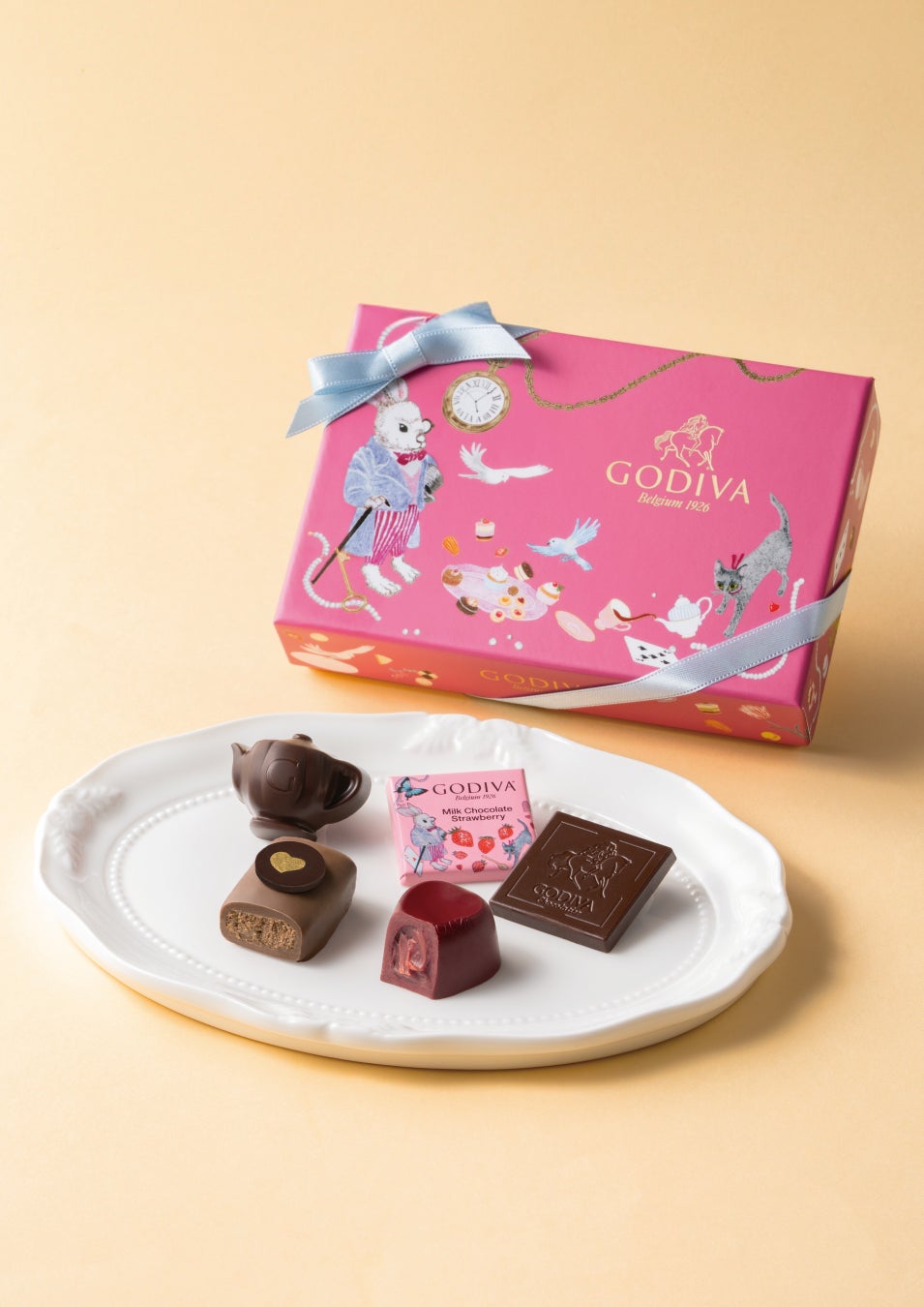 ティーパーティを彩る紅茶をイメージしたチョコレートやゴディバの100周年を記念してリニューアルされたハート形のチョコレート、シーズン限定カレなどを、物語のシンボルのトランプやティーセット、白うさぎなどを描いたパッケージに詰め合わせました。