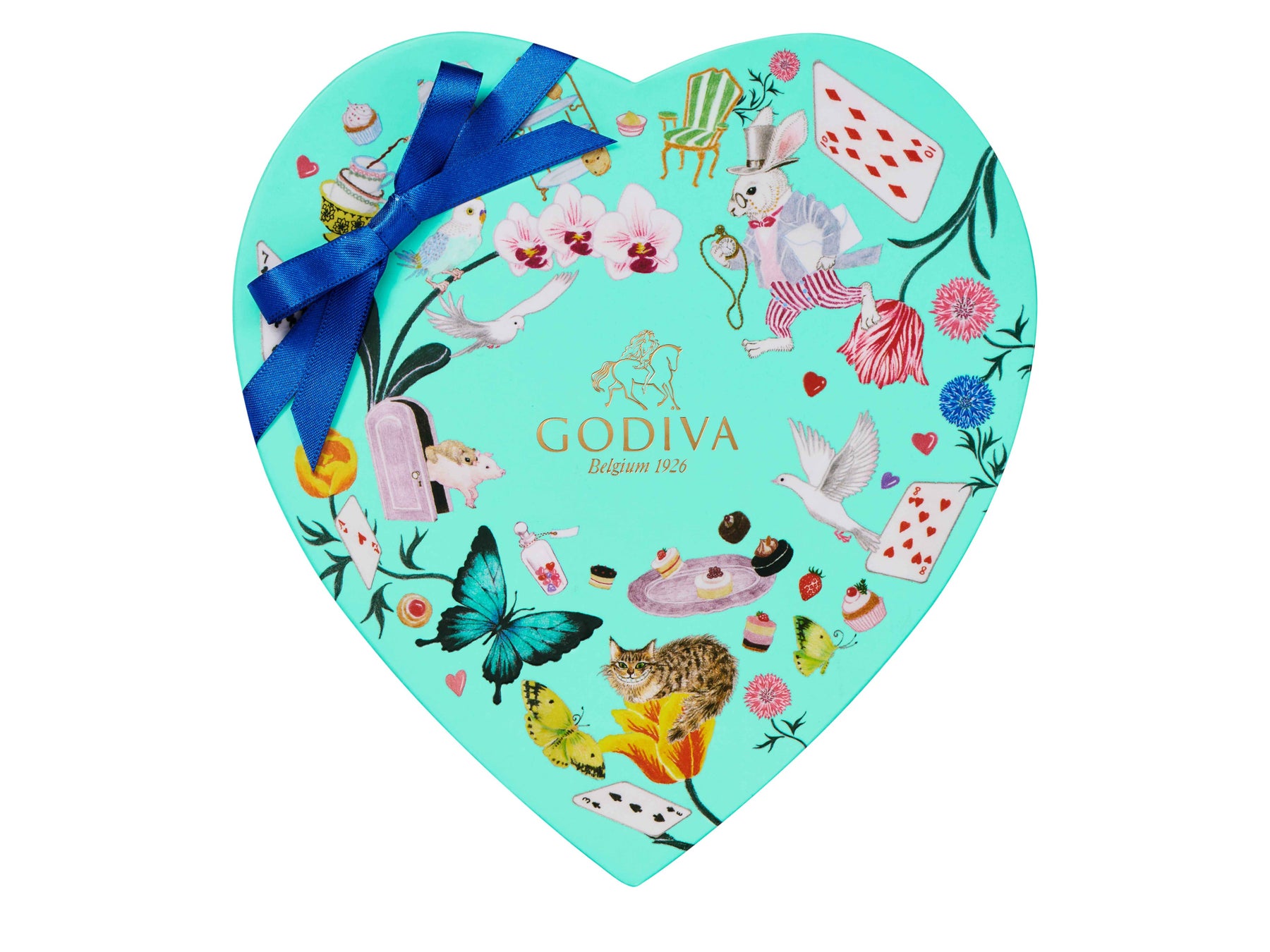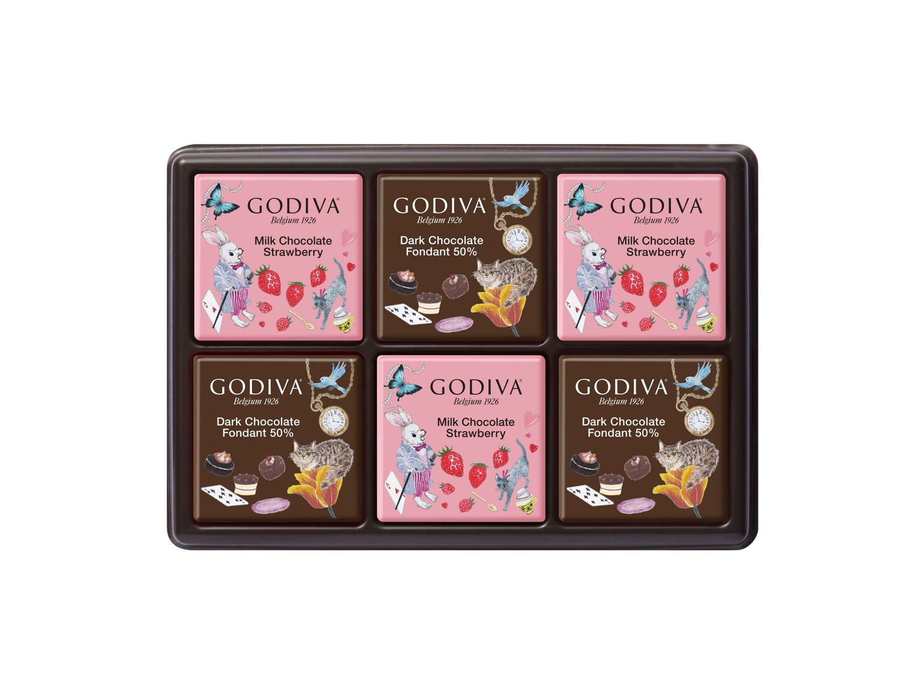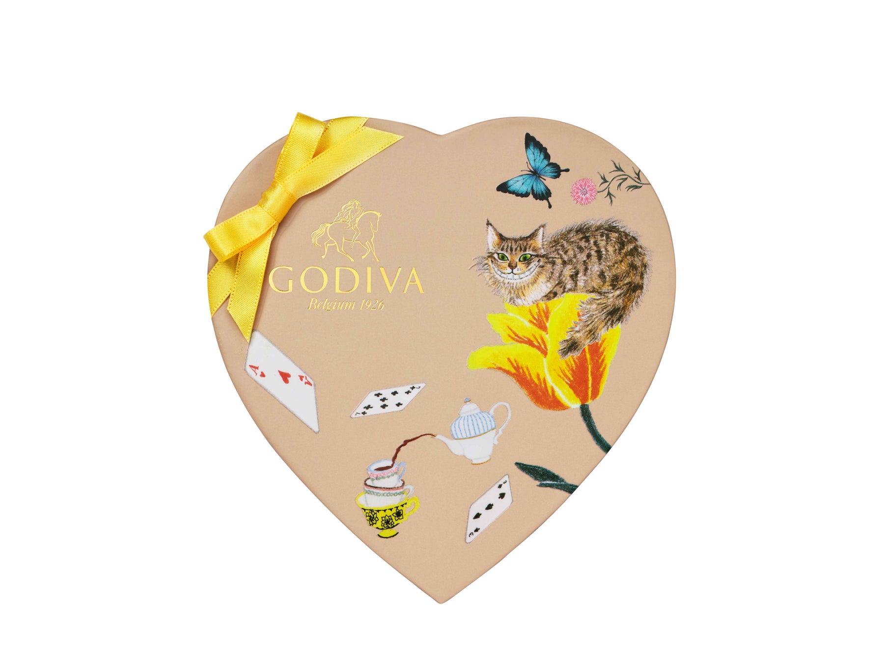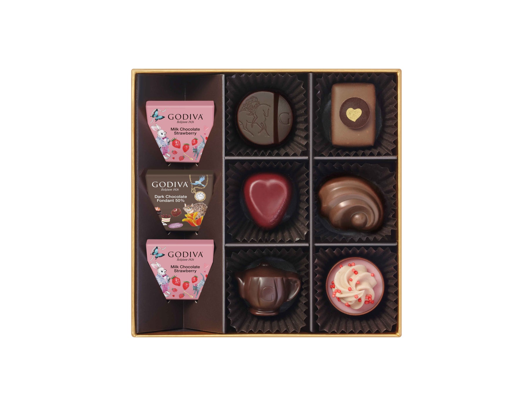 ティーパーティを彩る紅茶をイメージしたチョコレートやゴディバの100周年を記念してリニューアルされたハート形のチョコレート、シーズン限定カレなどを、物語のシンボルのトランプやティーセット、白うさぎなどを描いたパッケージに詰め合わせました。