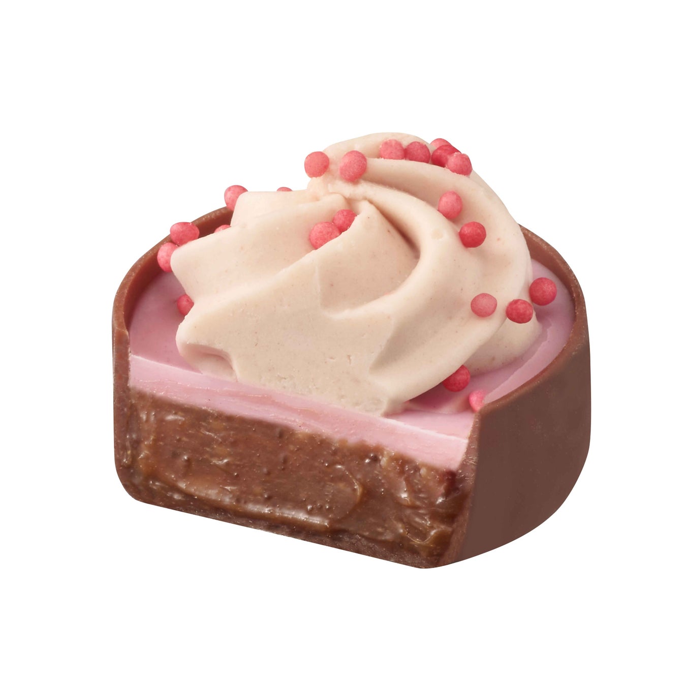 ストロベリーのコンフィチュールとムースをミルクチョコレートのカップで包みました。ピンク色のクリームに赤いチップをちりばめて、まるでティーパーティを彩るスイーツのようなひと粒です。