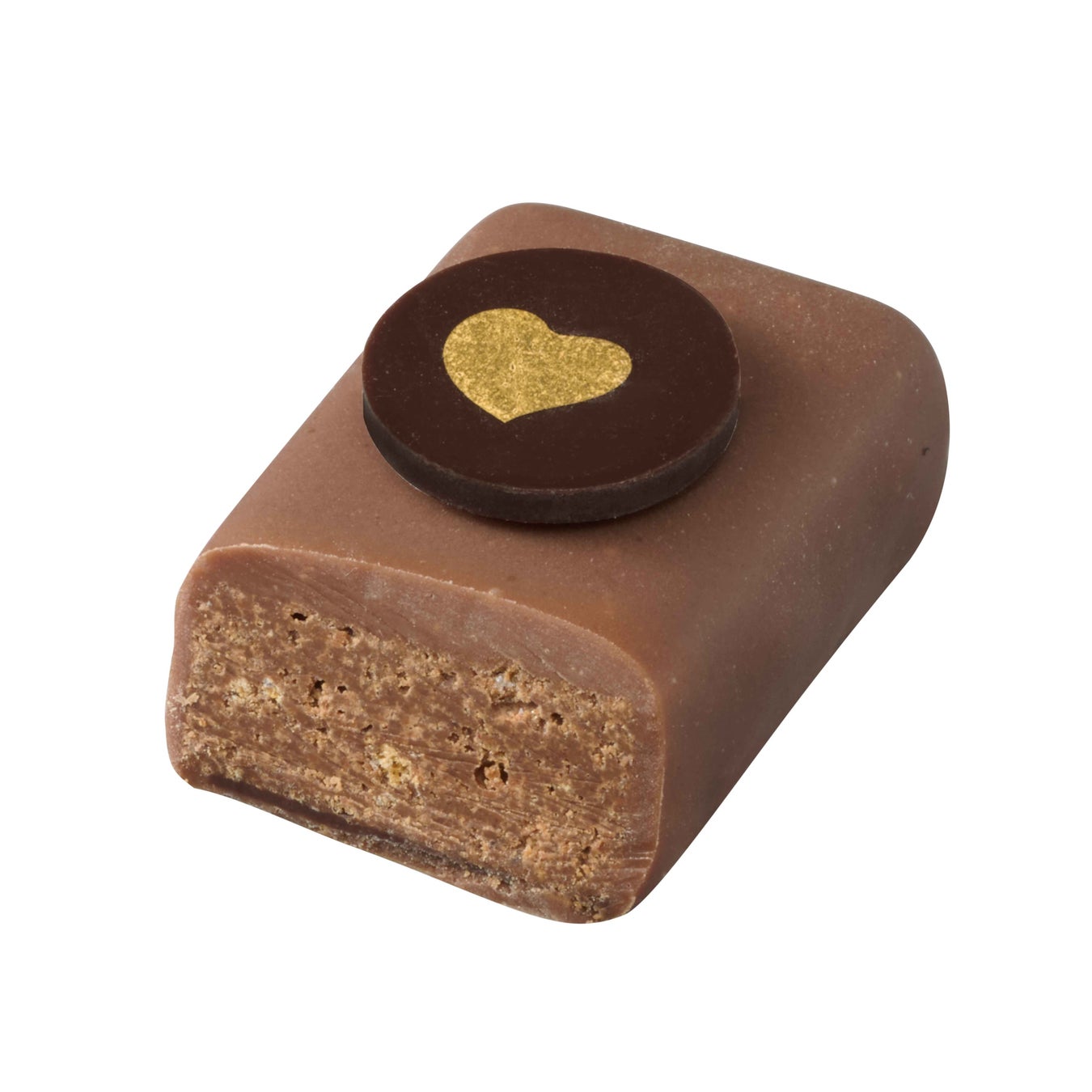 香ばしいスペキュロスプラリネを、繊細な薄いミルクチョコレートで包みました。金色のハートをトップに描き、ハートのエースを表現しました。