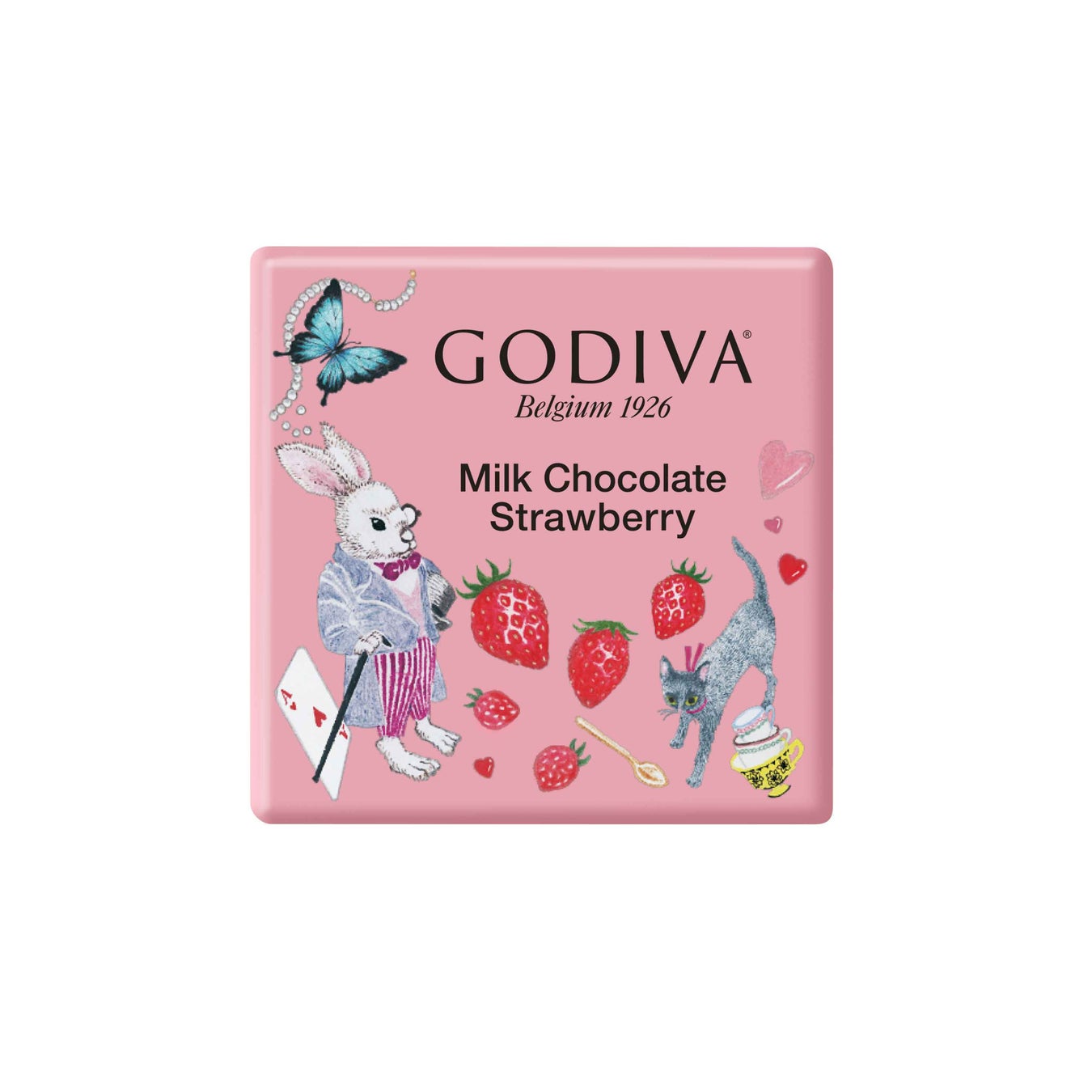 ストロベリー風味のミルクチョコレートとダークチョコレートフォンダンフレーバーのカレを、チェシャ猫や白うさぎを描いたオリジナルのラッピングで包みました。