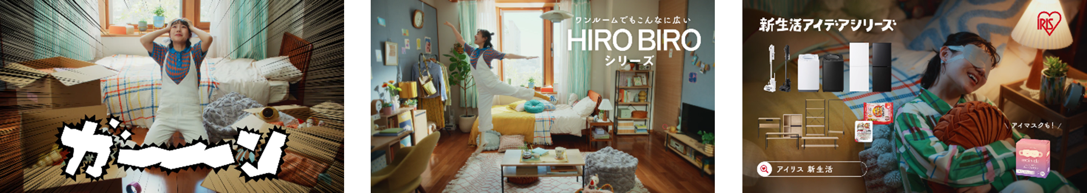 新居で「家具を置いたら部屋が狭くなる…?」とあたふたするあたふた子。でも、スリム設計の家具「HIRO BIRO series」で床も視界もすっきり広々。夜は「moi s cle じんわりホットアイマスク」でそっと心を整える。限られたワンルームでも「くつろぐ・楽しむ・整える」を叶えるアイリスの新生活アイデアシリーズ。