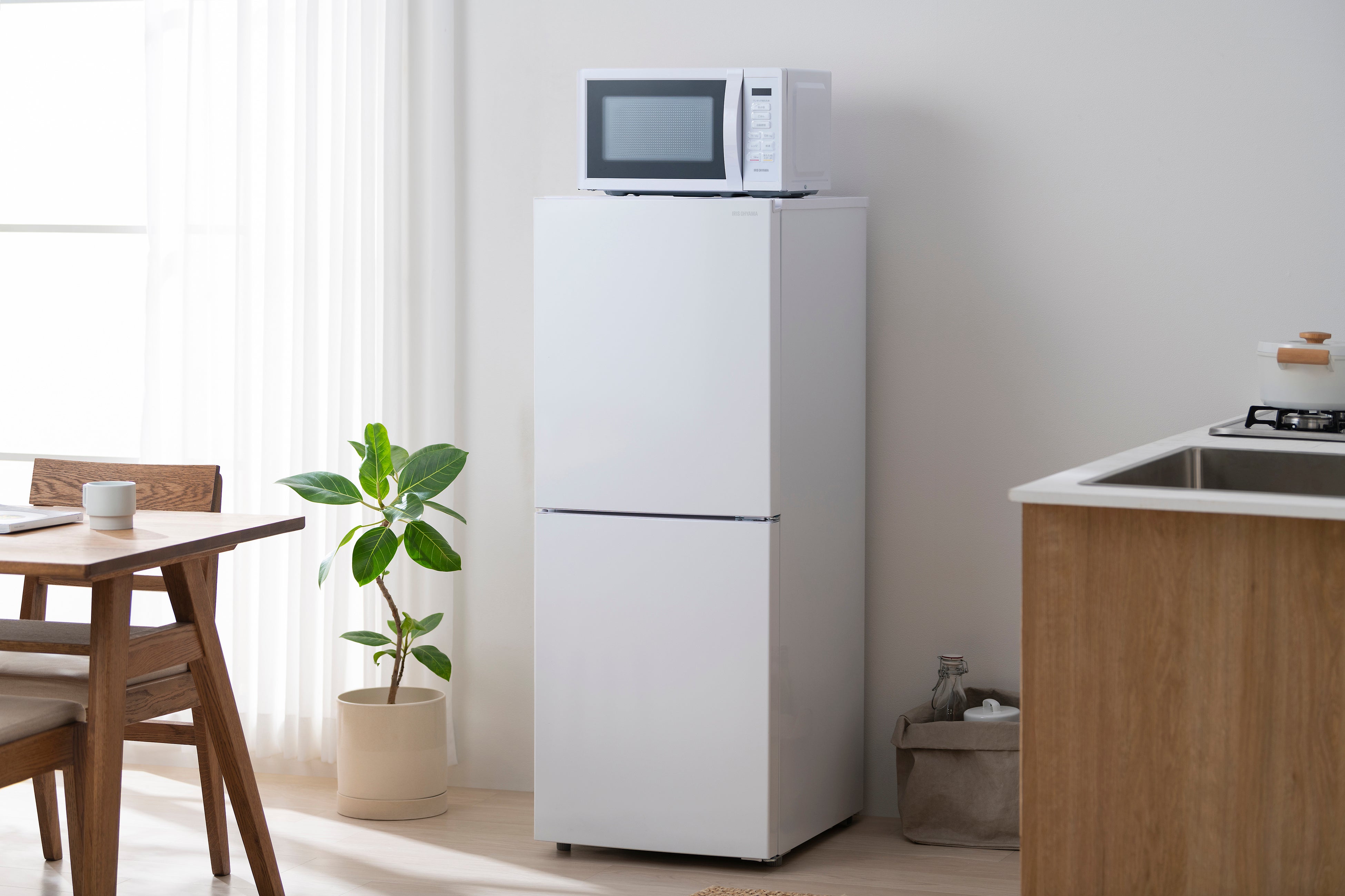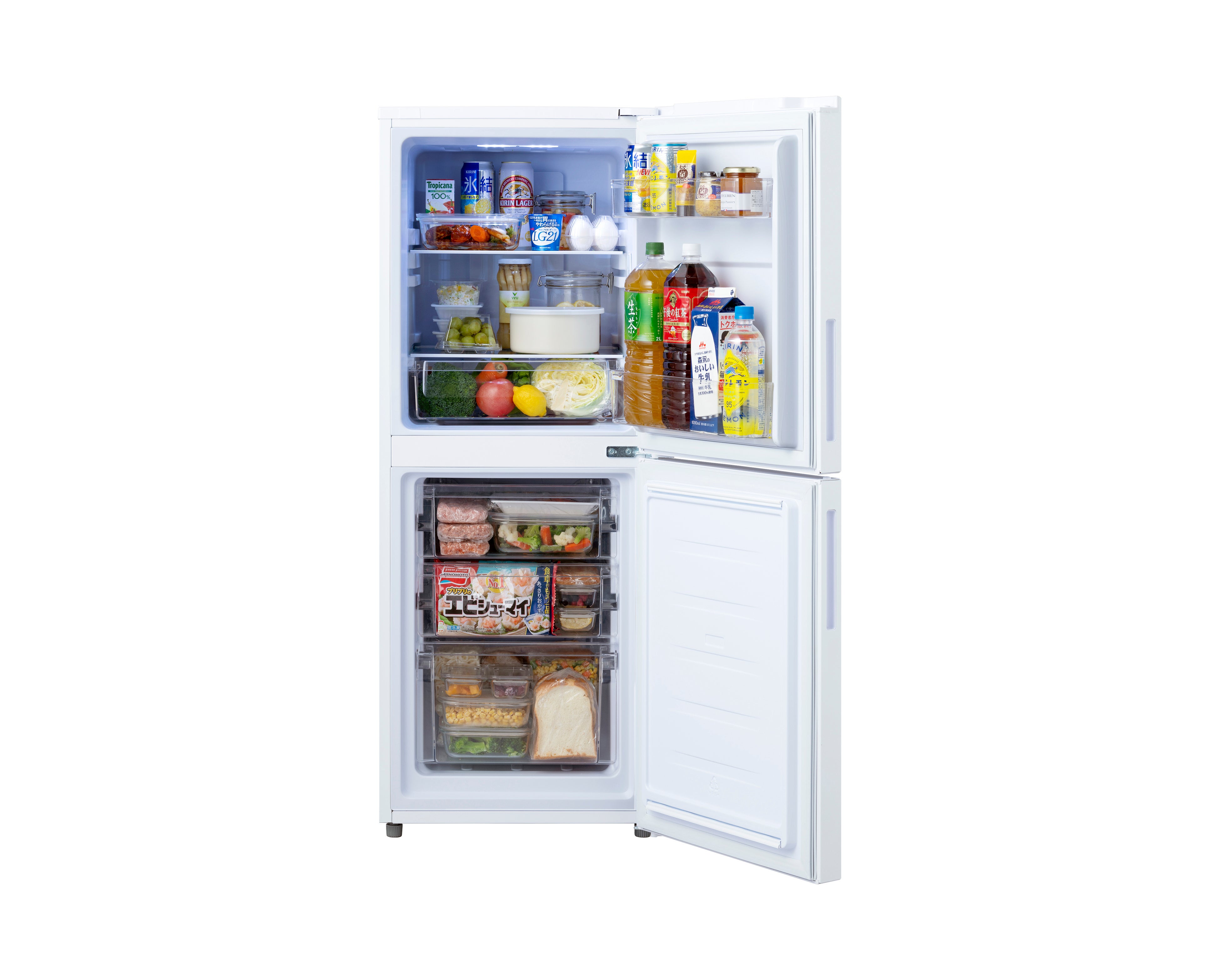 冷蔵庫容量のほぼ半分を冷凍室に配分した冷凍冷蔵庫で、冷凍食品や作り置きを買い物かご約1.1個分(※5)収納できます。新生活で特に多い「食材を使い切れず無駄にした、冷凍容量が足りない」といった悩み(※2)に対応し、従来品比で約10L(冷凍餃子約8個分)(※6)多く冷凍ができ、3段の引き出しケースで食材の大きさに合わせた保存が可能です。従来よりも高さを抑え、限られたスペースに収まるサイズなうえ、天板は耐熱式トップテーブルのため電子レンジやトースターを載せて設置することもできます。