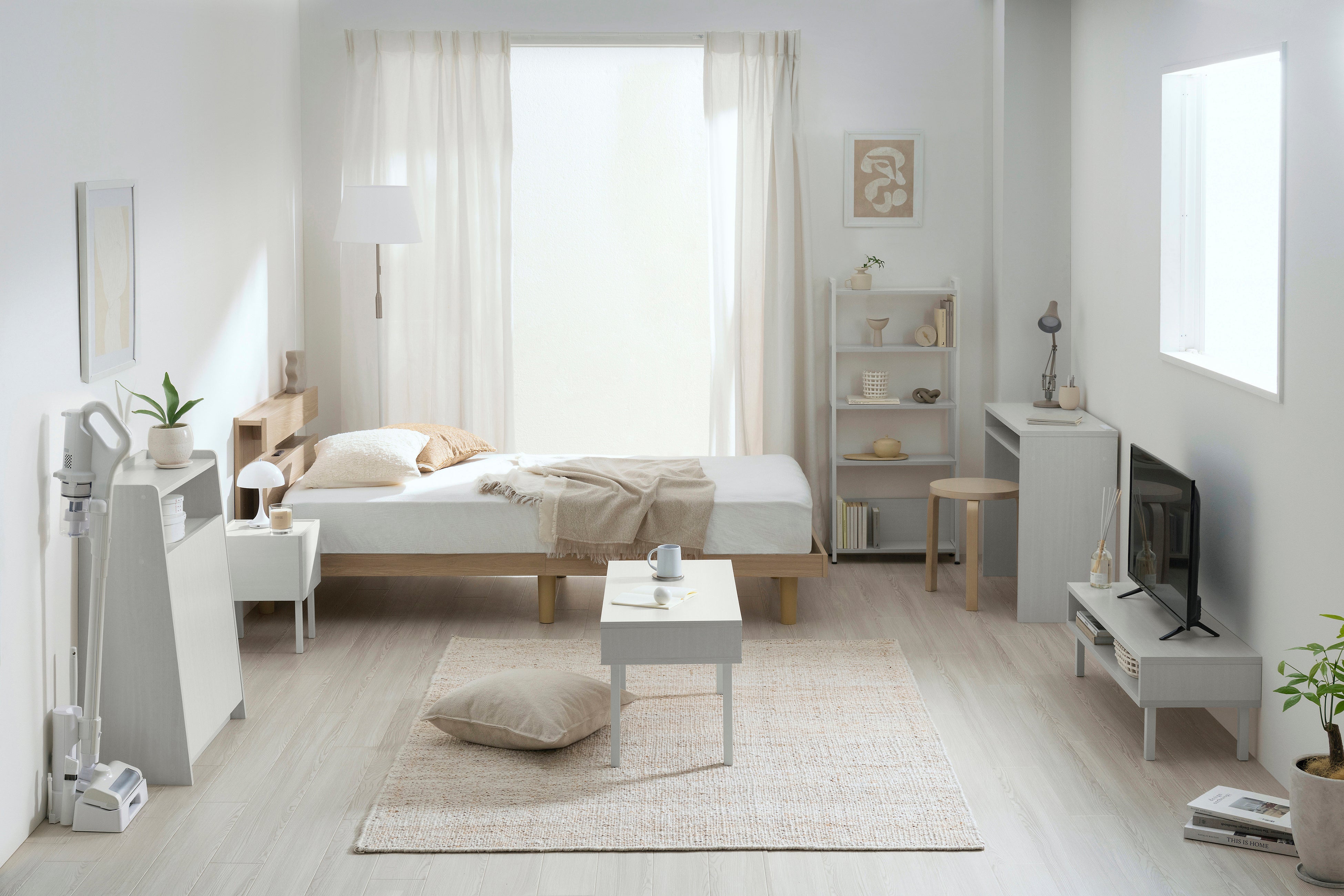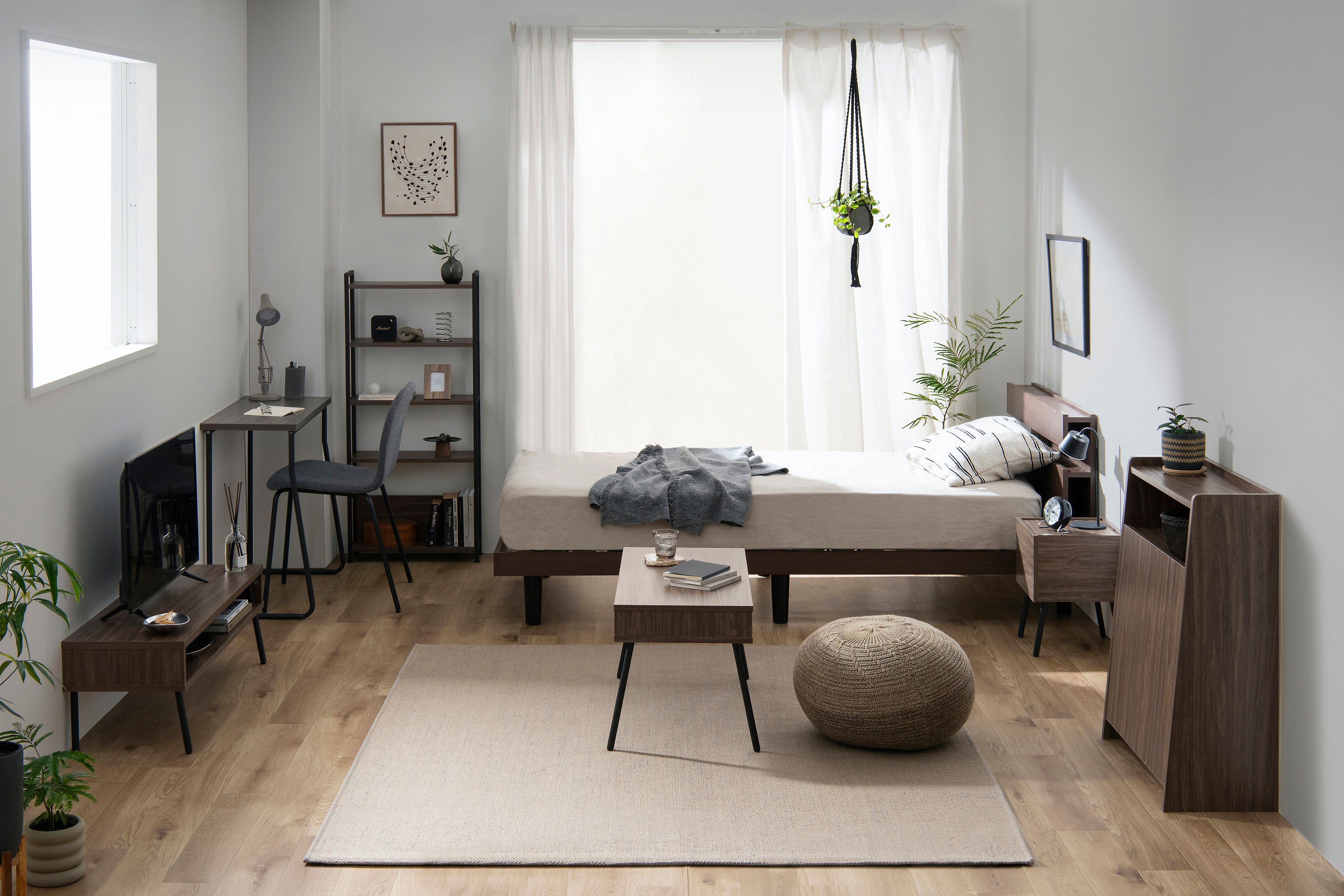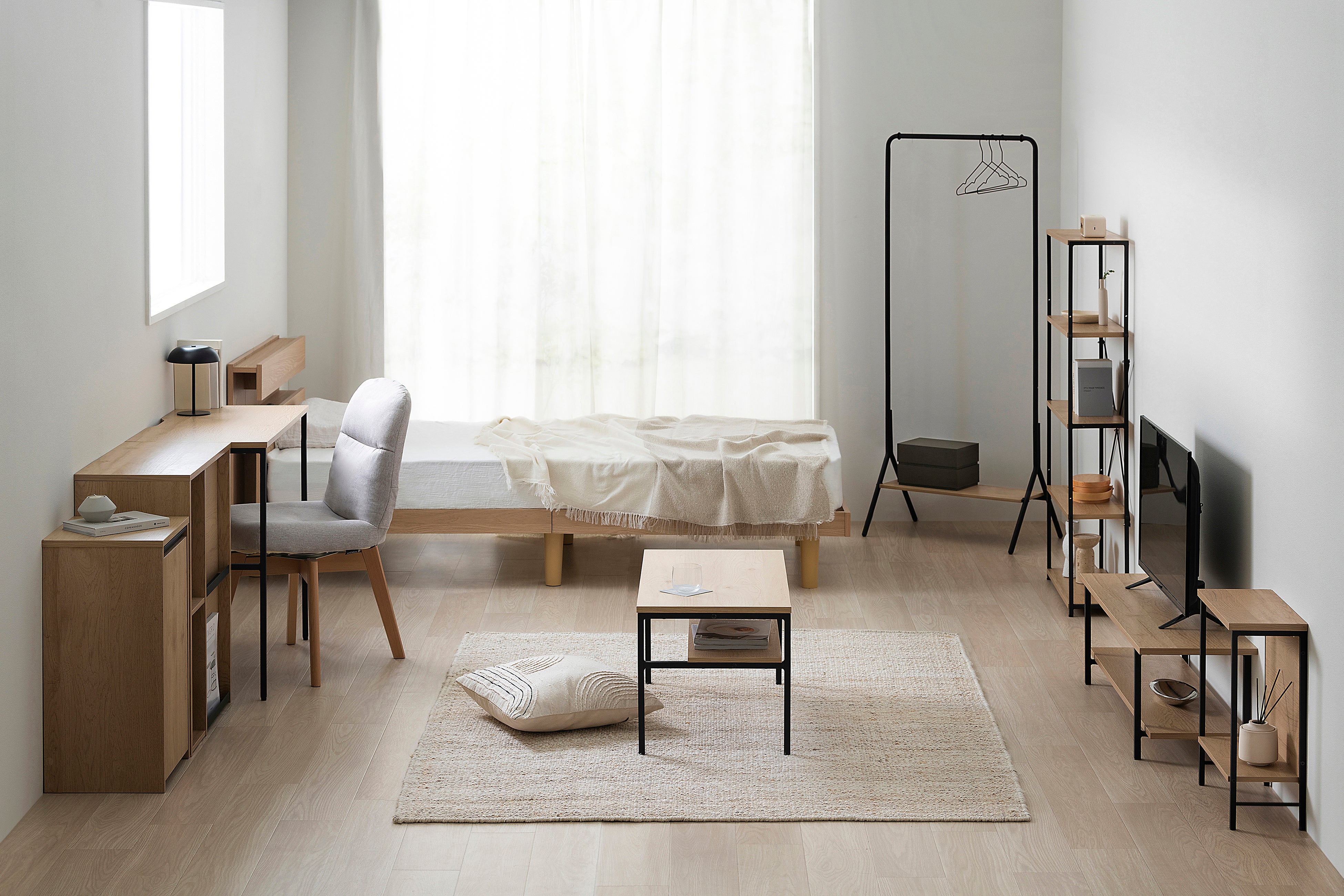 部屋を広く綺麗に使えるように、幅・奥行き・高さを抑えながらも魅せる・隠せる機能性と収納力を両立した、スぺパ発想の家具シリーズです。6畳前後の一人暮らしでも圧迫感のない空間づくりを実現し、新生活の住まいで感じる「収納不足・狭さ・スペース確保難」への不満(※2)を解消します。黒スチールと木目調を組み合わせたスタイリッシュなNatural style、明るく清潔感が感じられる白基調のWhite style、味わいある木目とマッドブラックアイアンで落ち着いた印象のBrown styleの3つのスタイルから部屋の形状や自分の好みに合わせて選べ、部屋全体に統一感をもたらします。