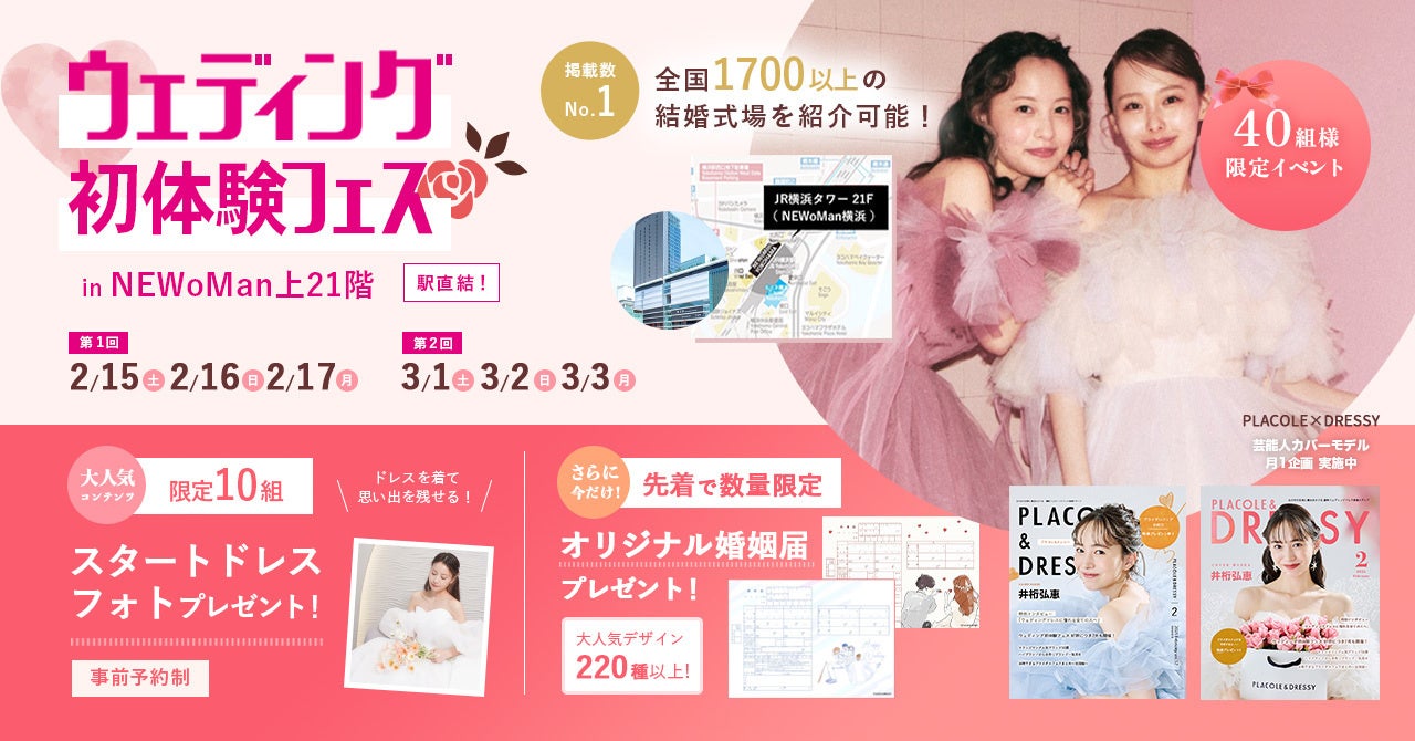 「PLACOLE & DRESSY」ブランドを展開する冒険社プラコレ(本社:神奈川県鎌倉市、代表取締役CEO:武藤功樹)は、横浜駅直結JR横浜タワー21F、ウェディングの魔法にかかる空間"DRESSY ROOM YOKOHAMA"にて、2/15(土)-2/17(月)の3日間限定で、これから結婚式をお考えのカップル様に向けた、個室相談やウェディングドレス試着ができる豪華特典付きのウェディング初体験フェスを開催いたします。(40組様限定、無料開催)