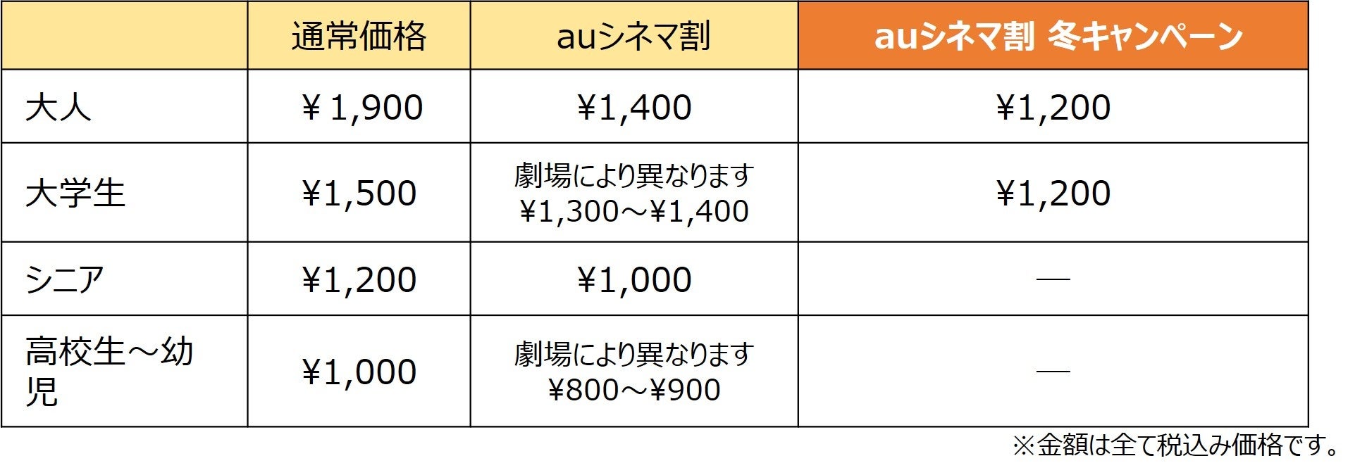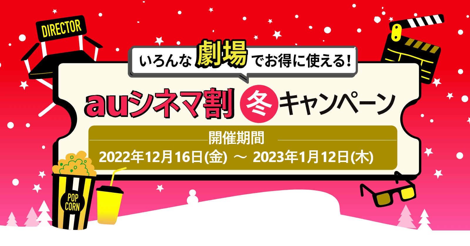KDDI株式会社は、映画割引クーポン「auシネマ割」において、2022年12月16日~2023年1月12日の4週間の期間限定で、auスマートパスプレミアム会員なら映画鑑賞料金を大人1,200円*で提供する「auシネマ割 冬キャンペーン」を実施します。