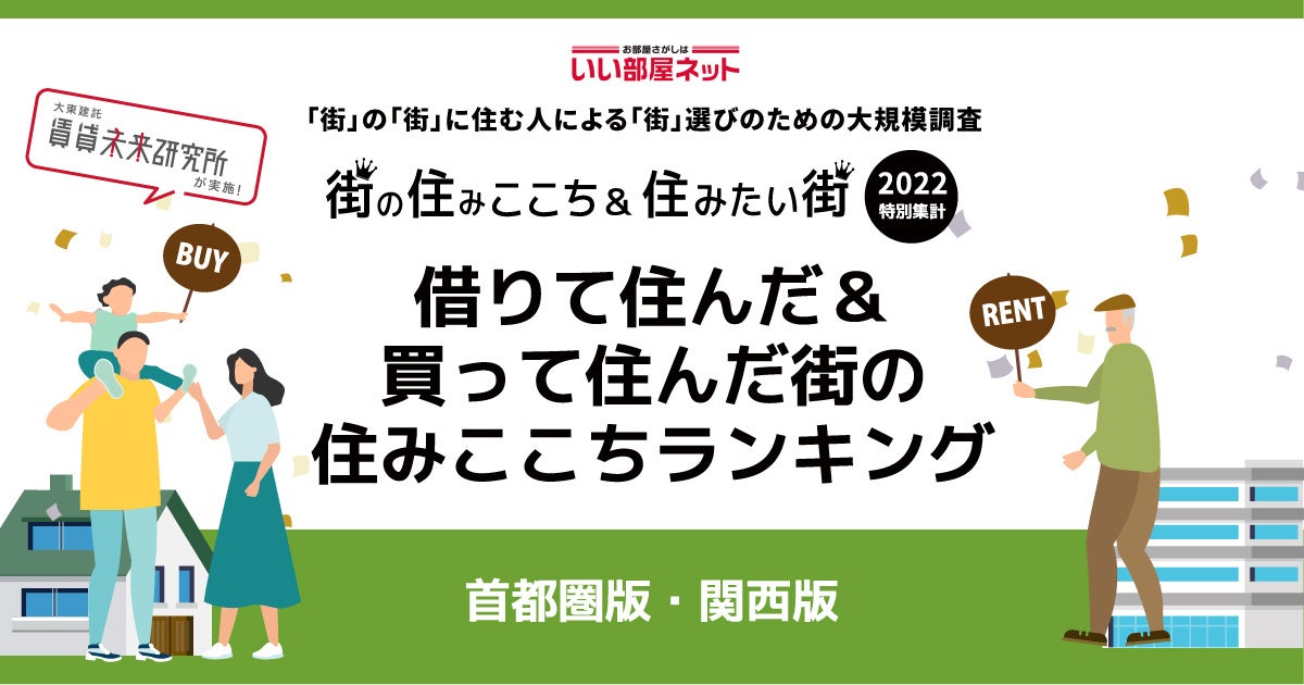 大東建託株式会社(本社:東京都港区、代表取締役社長:小林克満)は、過去最大級の居住満足度調査を行い、「借りて住んだ(賃貸)&買って住んだ(持家)街の住みここちランキング2022<首都圏版>」として集計しました。