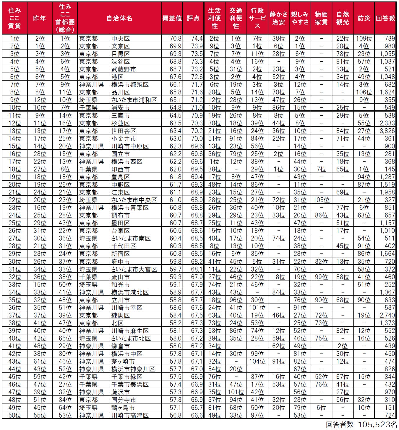 1位は東京都中央区で、唯一偏差値70台の極めて高い評価を得ています。2位は東京都文京区、3位は2年連続で東京都目黒区です。トップ3は、「街の住みここちランキング2022<首都圏版>」でも同じくトップ3となっている自治体です。