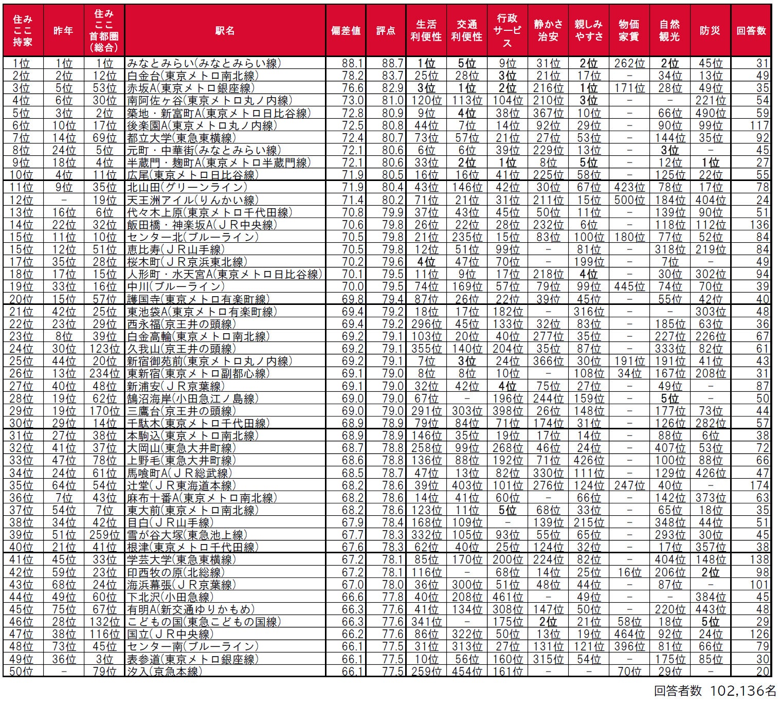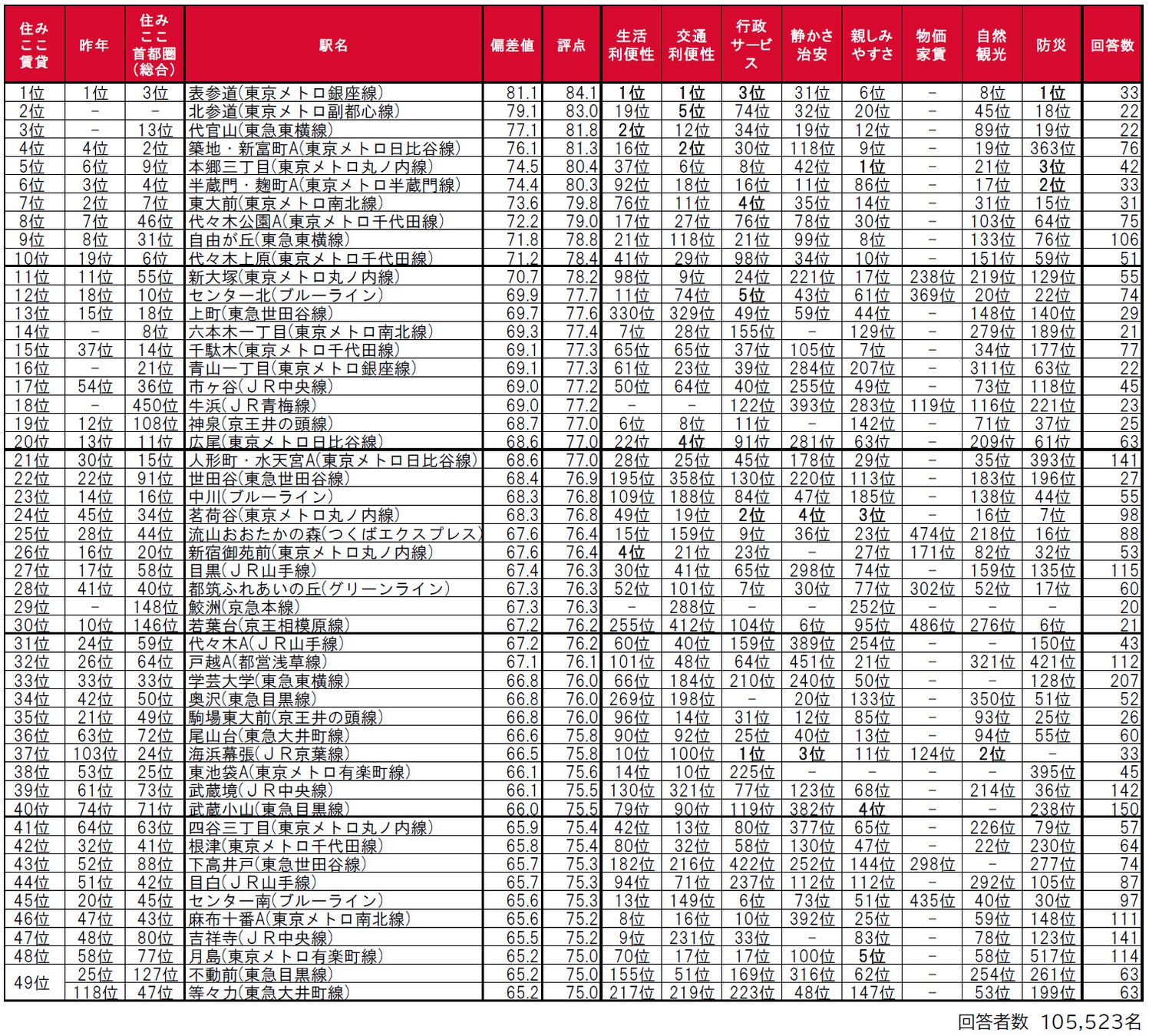 ●1位の表参道(東京メトロ銀座線)は唯一偏差値80台の極めて高い評価、また、2位~11位までの駅も、偏差値が70台の高い評価を得ています。また、12~49位の駅も偏差値60台で相対的に住みここちが良いという評価になっています。