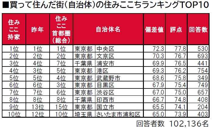 ■「買って住んだ街(自治体)の住みここちランキング」トップは、2年連続で東京都中央区