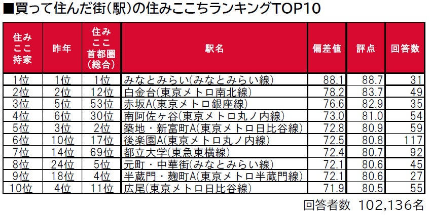 ■「買って住んだ街(駅)の住みここちランキング」トップは、2年連続でみなとみらい