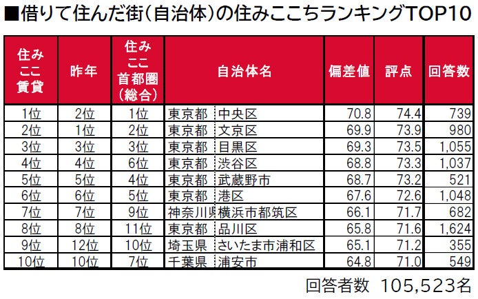 ■「借りて住んだ街(自治体)の住みここちランキング」トップは、東京都中央区