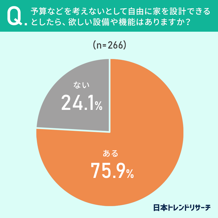 75.9%の方が「予算などを気にせず自由に家を設計できるとしたら、欲しい設備や機能がある」と回答しています。