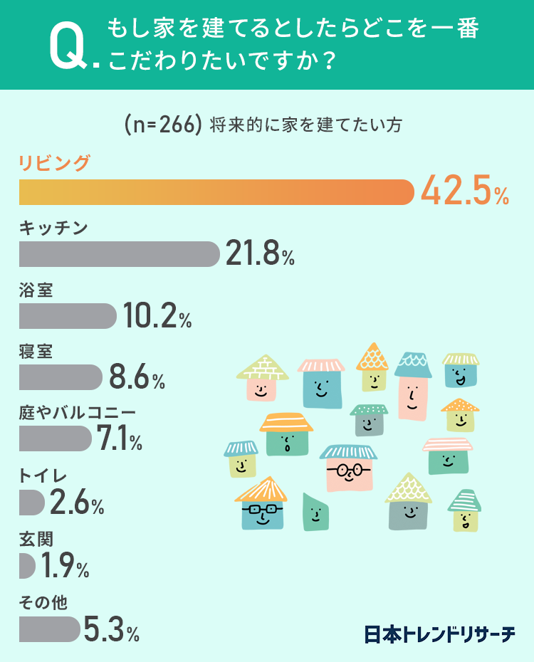 将来家を建てたいと考えている方の42.5%が「リビングを一番こだわりたい」と答えており、その理由は「家族で過ごす場所だから」「来客があるから」などが多くあるようです。
