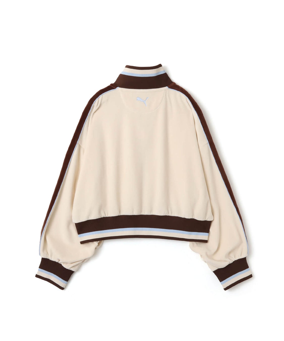 今回の別注作に付随し、「atmos pink」と「PUMA」のコラボレーションアパレルも作製。トレンドカラーのブラウンとデニムを意識したブルーカラーがポイントのベロア素材のジャージのセットアップとナンバリングのプルオーバーが完成しました。