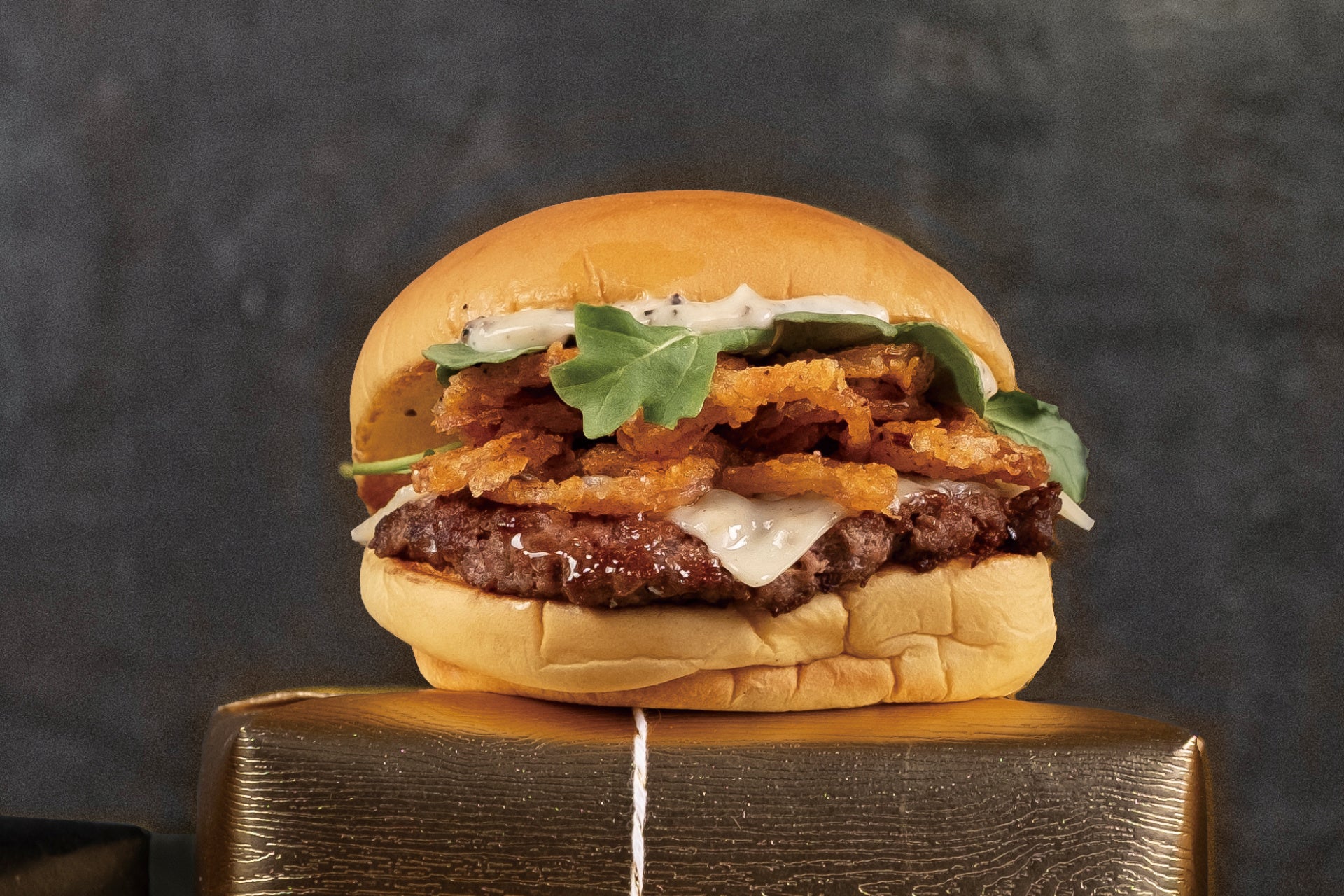 内容:ホルモン剤フリーのジューシーなアンガスビーフ100%パティ、高級食材の黒トリュフの香りが食欲をそそる特製のブラックトリュフ入りマヨネーズ、甘みや香ばしさのあるフライドオニオン、味に深みを与えるエメンタールチーズ、ほろ苦さがアクセントになるルッコラをトッピングした、プレミアムなグルメバーガーです。
