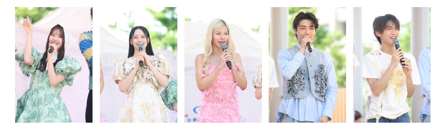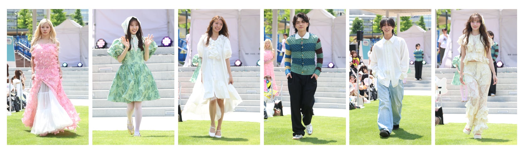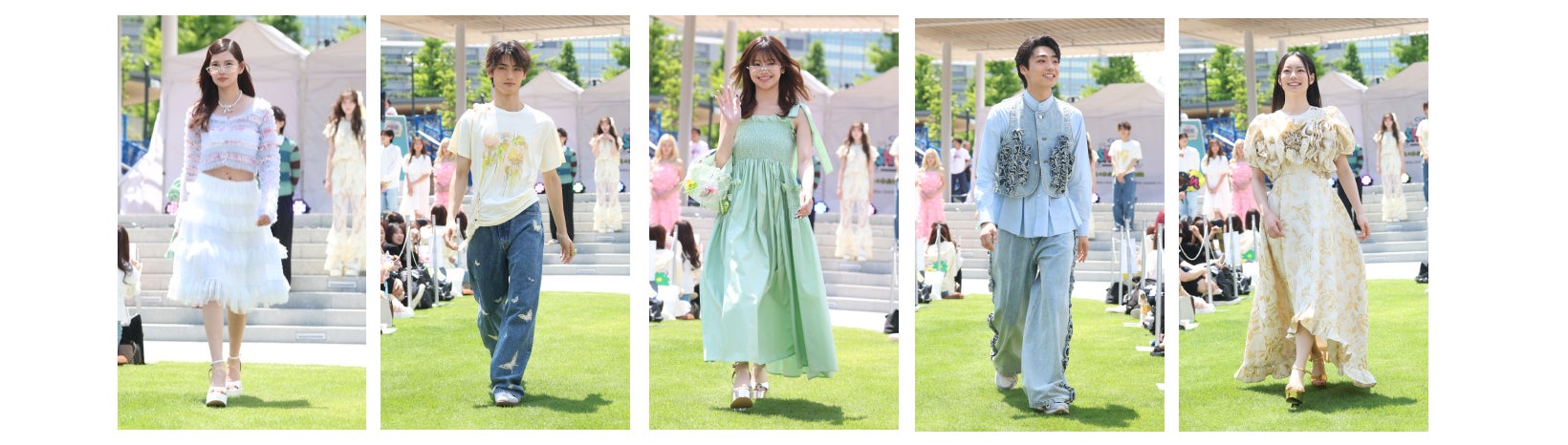 渋谷区が推進する“緑のある都市づくり”の想いを受け、渋谷の街にさまざまな夢が咲き誇るステージを・・・と願いを込めて「wish」をテーマにしたファッションショーを展開しました。トップバッターに、トップインフルエンサーに留まらず、アーティストとしても活躍の場を広げているとうあが、咲き誇るような華やかなピンクの花柄ドレスで登場!続いて、女優・タレントとして活躍する市川美織がふんわりと広がるグリーンのミニドレスを、宮武颯(WILD BLUE)が鮮やかなボーダーニットが特徴的なスタイリングを、池田優斗(WILD BLUE)が爽やかなフリルが施された白シャツスタイルを、今回が初ランウェイとなる髙橋颯(WATWING)が蝶のデザインが入ったデニムと花柄Tシャツの明るく夏らしいコーディネートを、八村倫太郎(WATWING)がフリルをあしらったライトブルーの上下デニムのセットアップ姿を披露しました。そしてラストには、Z世代のファッションアイコンであるなごみが金の花柄刺繍と、胸元の立体装飾が目を引く、まるで女神のような上品で華やかなドレスで登場し、ランウェイを彩りました。