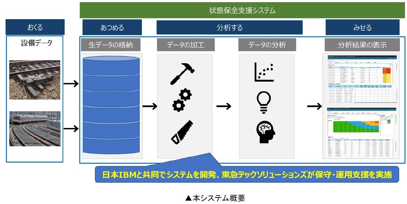 東急電鉄株式会社(以下、東急電鉄)、日本アイ・ビー・エム株式会社(以下、日本IBM)は、テクノロジーを活用した鉄道設備の保守業務の高度化に向け、東急電鉄と日本IBMが共同で開発した「状態保全(CBM:Condition Based Maintenance)支援システム」(以下、本システム)を活用した、鉄道設備の状態モニタリング、リスクスコアの可視化を4月下旬より運用開始します。なお、本システムの保守・運用は東急テックソリューションズ株式会社(以下、東急テックソリューションズ)が行います。