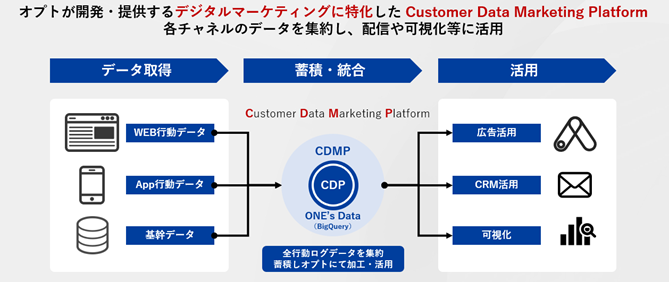 オプトは、このような状況を踏まえ、Google Cloud の BigQuery™ (※3)を基盤に、統合データ活用プラットフォーム「ONE's Data(ワンズデータ)」を開発し、ポストCookie時代における顧客の広告体験向上を目指し、企業様のデジタルマーケティング活動を支援しています。2021年6月より提供を開始した「ONE's Data」は、2022年2月時点で100社以上の企業様に導入いただいております。