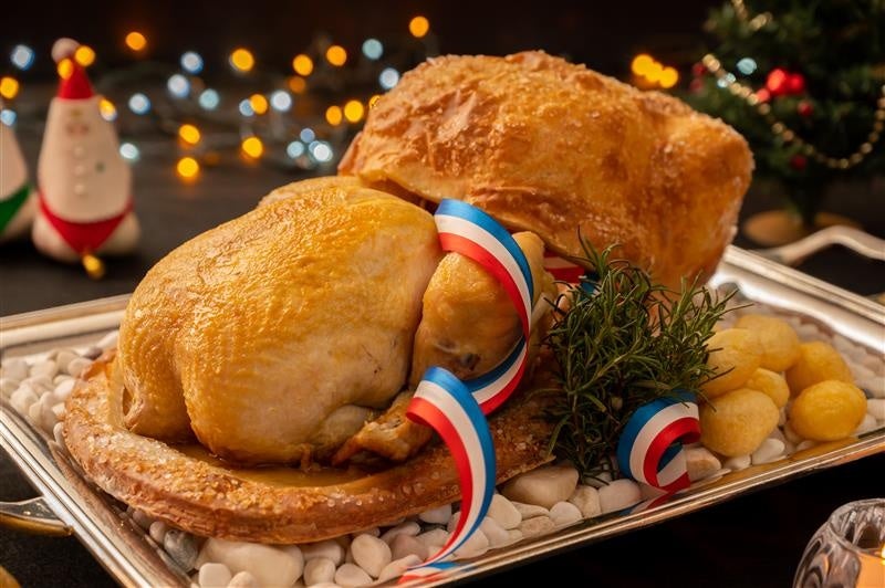 シェフ厳選の鶏に4種のハーブとガーリックを詰め、岩塩を練り込んだパイで包み焼き上げた、特製クリスマスチキン。ジューシーで柔らかな若鶏をお楽しみください。