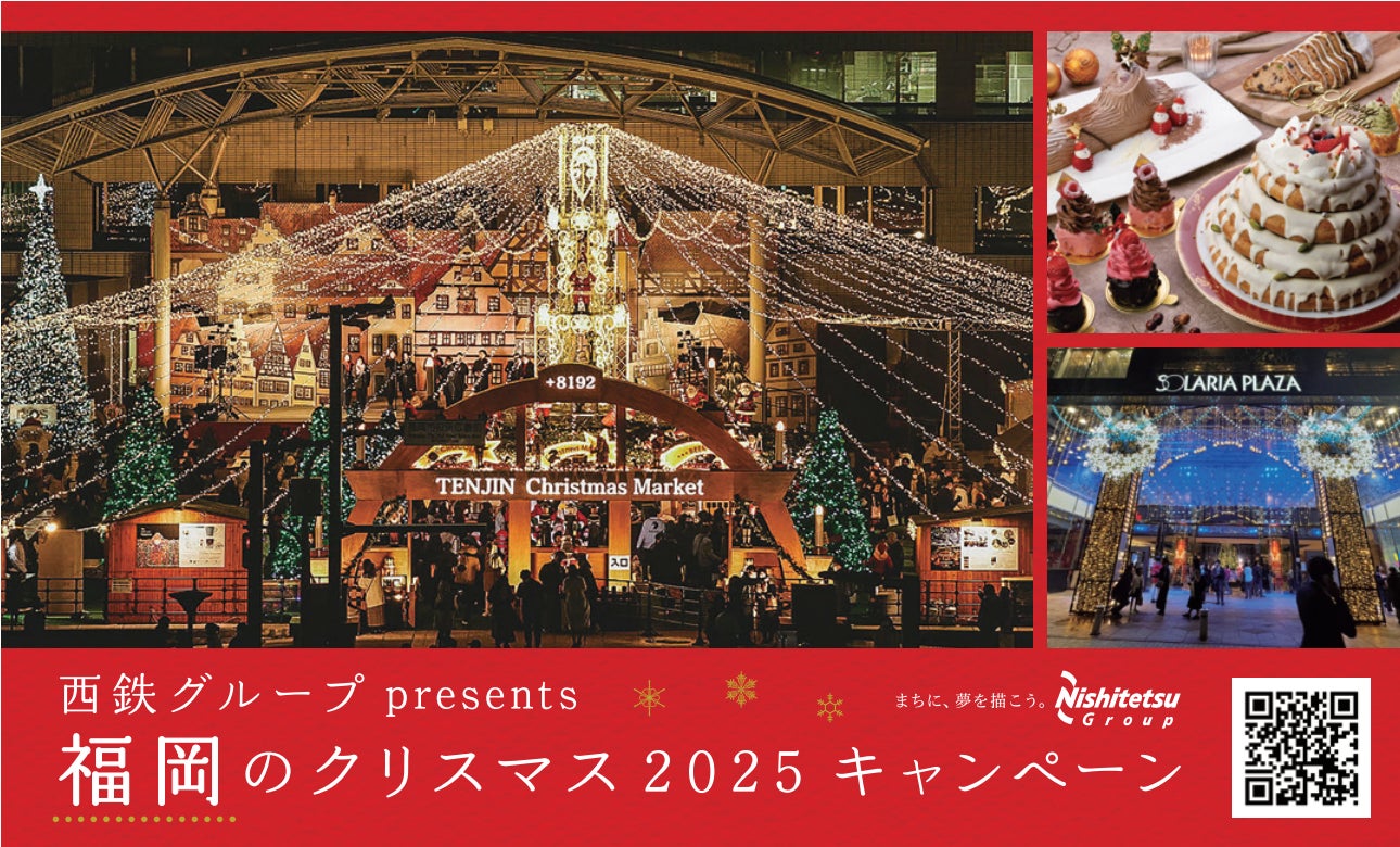 西鉄グループでは、11月12日(水)から12月25日(木)の期間中、「福岡のクリスマスへ行こう!2025」キャンペーンを実施します。「クリスマスアドベント※」と連動した商品・サービスをお客さまに提供し、西鉄グループ内外の企業連携を通して観光プロモーションを行うなど、クリスマスでにぎわうまちをさらに盛り上げ、福岡県内外からの観光需要創出に取り組みます。
