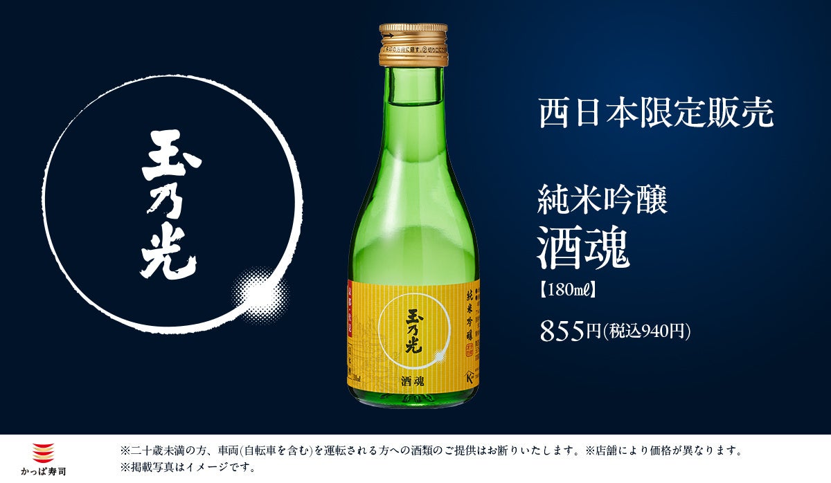 西日本エリアでは、米100%の純米清酒を業界に先駆けて開発した「玉乃光酒造」の『玉乃光 酒魂(しゅこん)』をご提供。米の旨みと香りが活きた純米吟醸酒は、バランスのとれたキレのある味わいで、「まぐろ」や「穴子」などのネタにぴったりです。