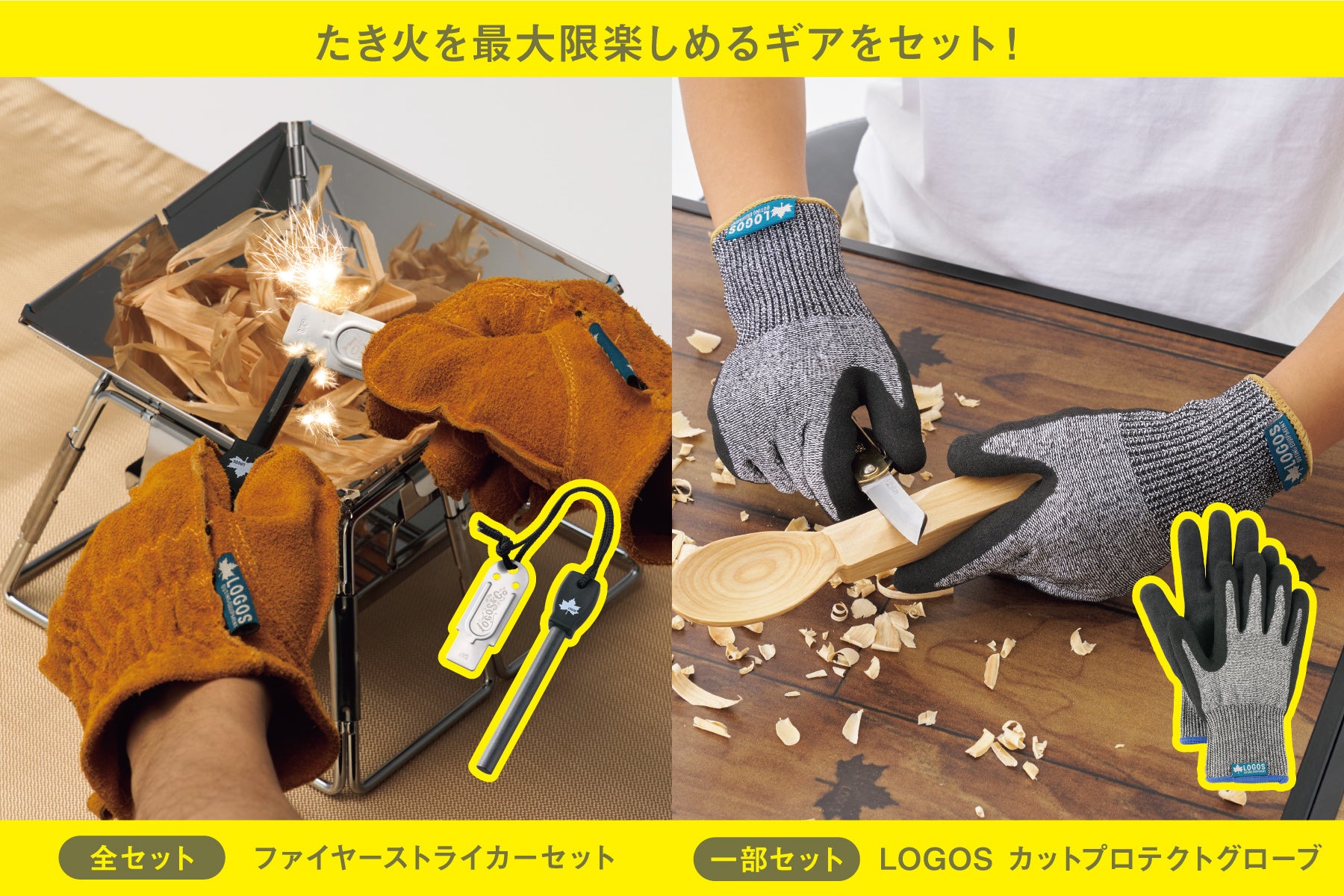 昨年9月に実施したクラウドファンディングでの先行販売では開始後約5時間で目標金額を突破し、達成率782%で完売しました。今回のクラウドファンディングでは、全てのセットに強力火花&極太かつロングで長持ちの火おこし道具「ファイヤーストライカーセット」が含まれており、そのほかにも刃物で切れにくい生地を使用した「カットプロテクトグローブ」が付いたセットもご用意いたしました。簡単かつ安全に火おこしやブッシュクラフトを楽しめるアイテムを、お得にお買い求めいただけます。