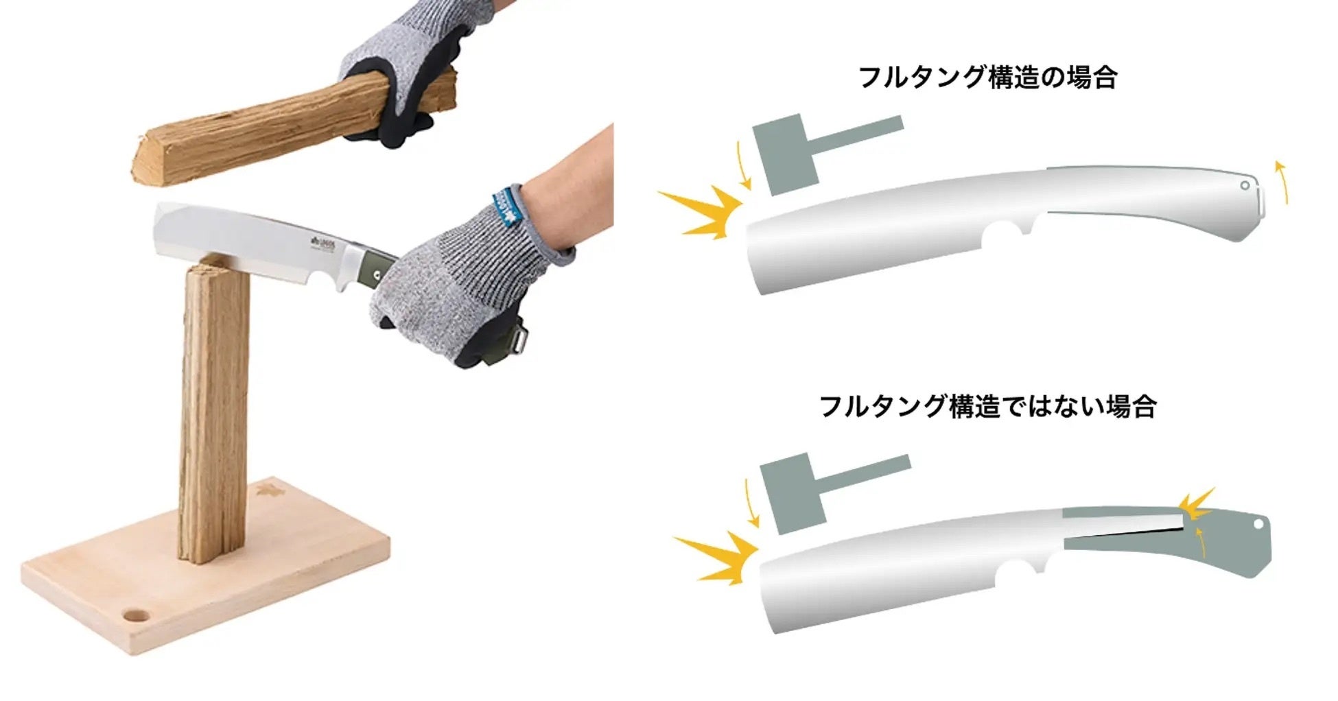 ブレードを構成する1枚の金属の板がナイフの先端から後端まで通っているフルタング構造のため衝撃を与えても破損しにくいうえ、5.5mm厚のブレード&500gの重量のコンビネーションが生み出すパワーで、豪快な威力のバトニングが楽しめる。