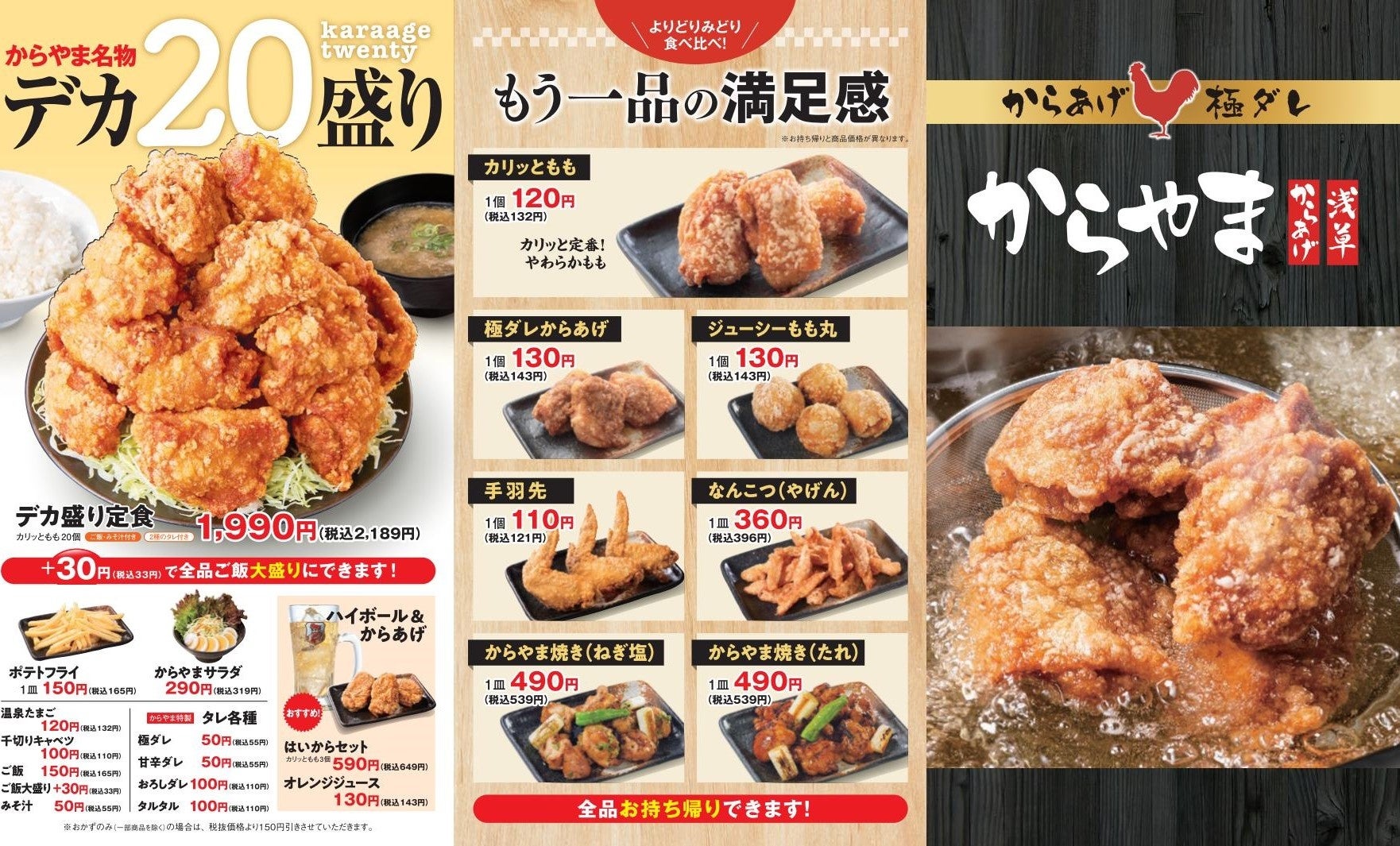「からやま」は、2010年5月に浅草総本店をオープンした伝説のからあげ「からあげ縁-YUKARI-」のニンニクや生姜を使用せず鶏の旨味を引き出す、限られた人しか製法を知らない「秘伝の特製漬け込みダレ」で仕上げた「カリッともも」を、ご飯のおかずとして揚げたてを食べられたらお客様に喜んでいただけるのではと考え、とんかつ専門店「かつや」とコラボレーションし、2014年12⽉に「からあげ定食専門店」として1号店を相模原市に開店しました。