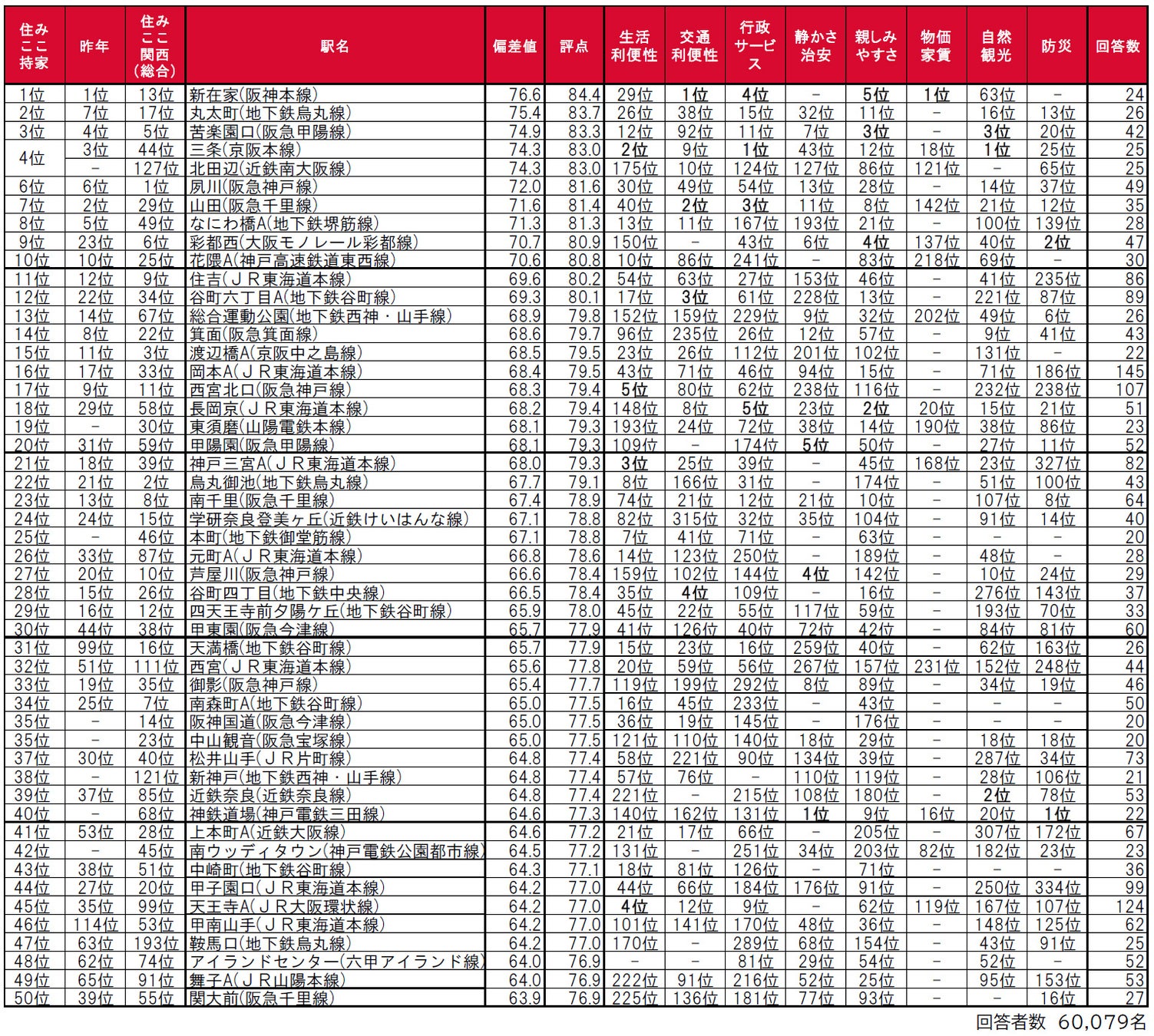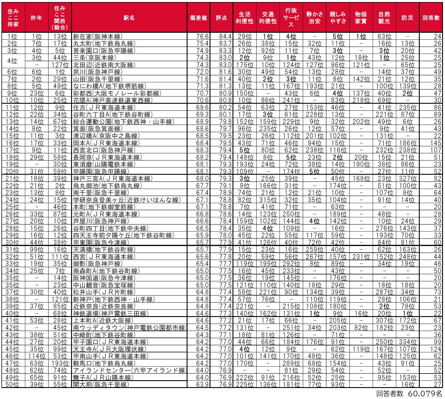 ●10位までの駅は、偏差値が70台と極めて高い評価を得ています。また、11位~50位の駅も偏差値60台で相対的に住みここちが良いという評価になっています。