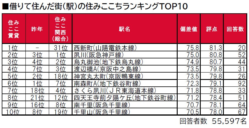 1位は、昨年は累計回答数が20名未満だったためランキング集計対象外だった西新町(山陽電鉄本線)です。2位は夙川(阪急神戸線)で、「街の住みここちランキング2022<関西版>」で1位の駅です。3位は、烏丸御池(地下鉄烏丸線)で、「街の住みここちランキング2022<関西版>」で2位の駅です。
