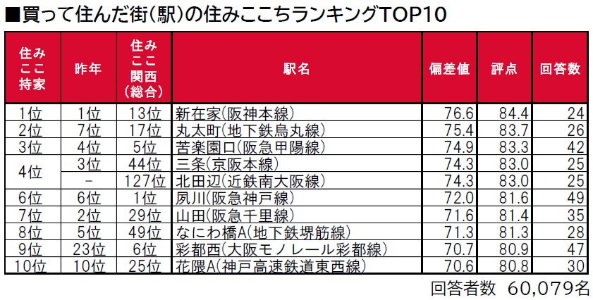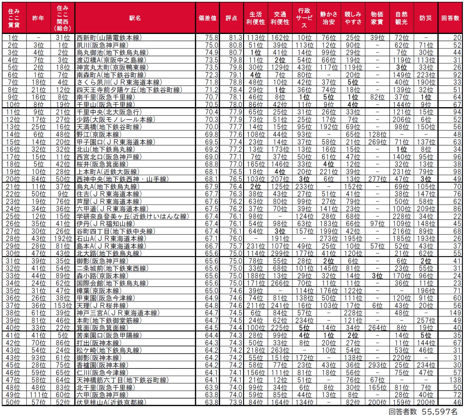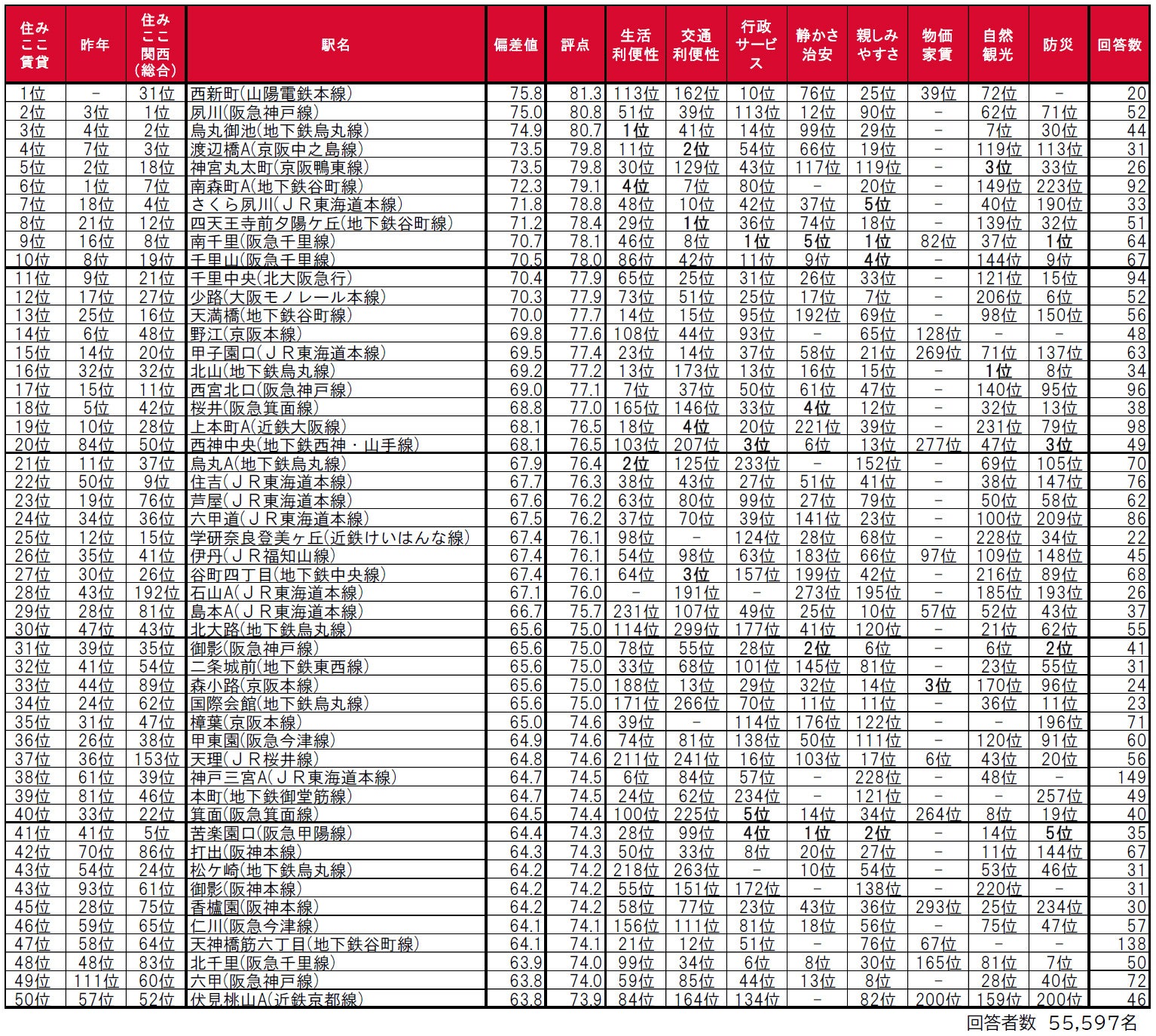 •「買って住んだ街(駅)の住みここちランキング」は、関西エリアの持家居住者を対象に、2019年~2022年の4年分の回答を累積し、駅徒歩15分以内に居住している回答者が20名以上の駅をランキング対象として集計しています。