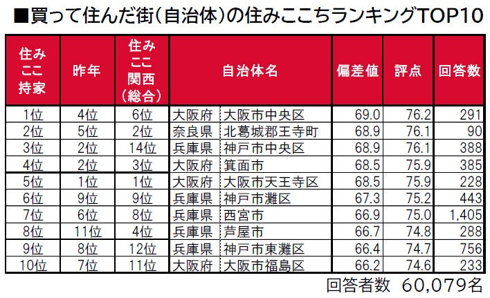 ■「買って住んだ街(自治体)の住みここちランキング」トップは、大阪府大阪市中央区