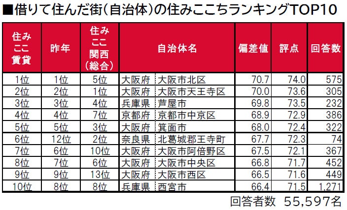 ■「借りて住んだ街(自治体)の住みここちランキング」トップは、2年連続で大阪府大阪市北区
