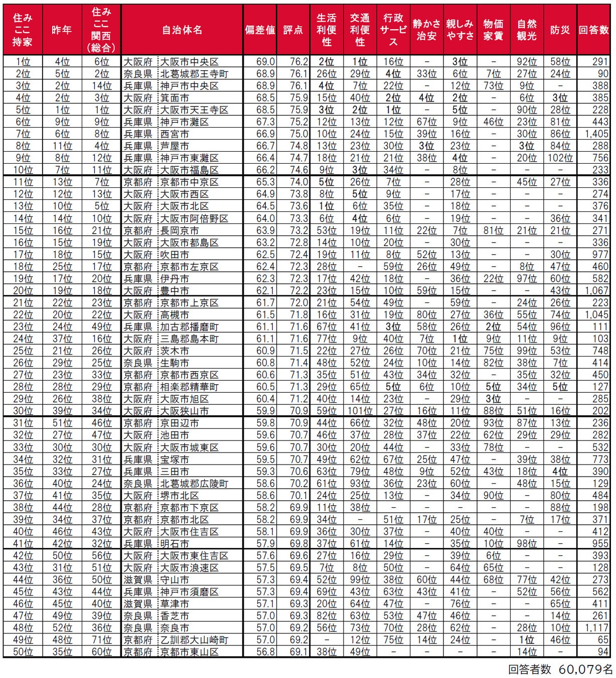 1位は大阪府大阪市北区、2位は大阪府大阪市天王寺区、3位は兵庫県芦屋市で、トップ3は昨年と全く同じ結果で2年連続のランクインとなっています。また、4位と5位も京都府京都市中京区、大阪府箕面市となっており、トップ5に変動はありません。