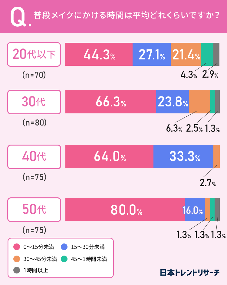 特に50代の方は80%と大半の方が「0~15分未満」と回答し、メイクにあまり時間をかけていないようです。