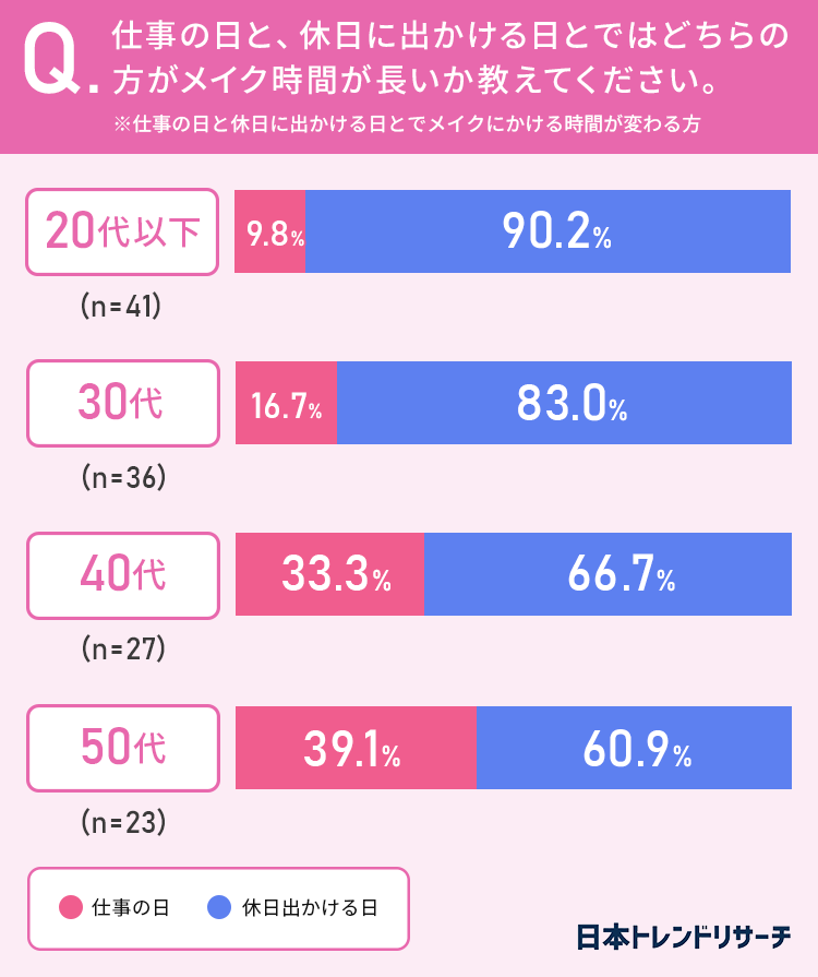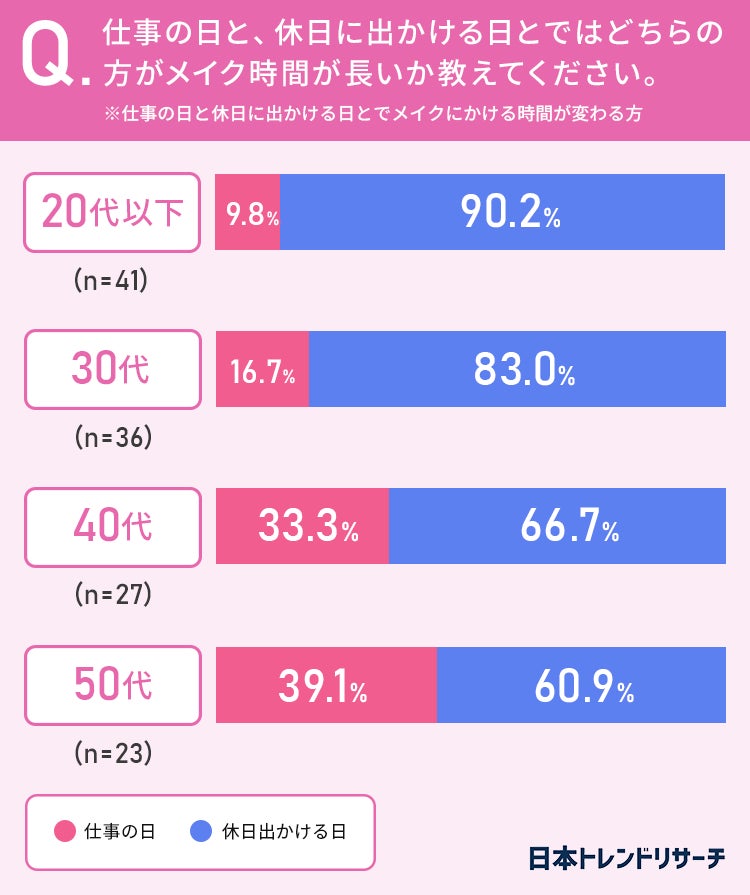 20代以下のおよそ9割以上の方が「休日出かける日」の方がメイク時間が長い、と答えました。